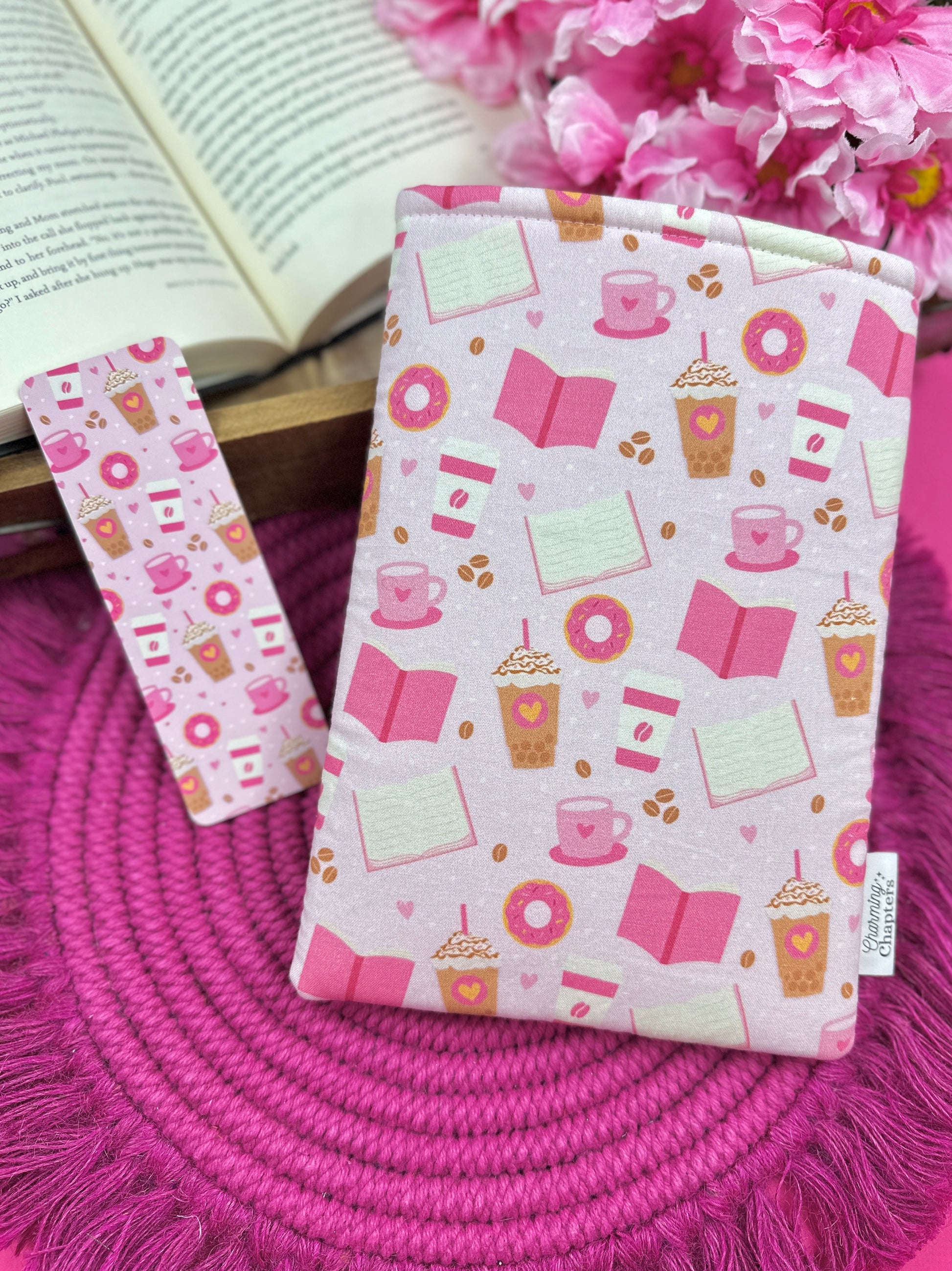 This book sleeve's pattern features a pink coffee & donut lover design and has a matching solid pink inside lining.