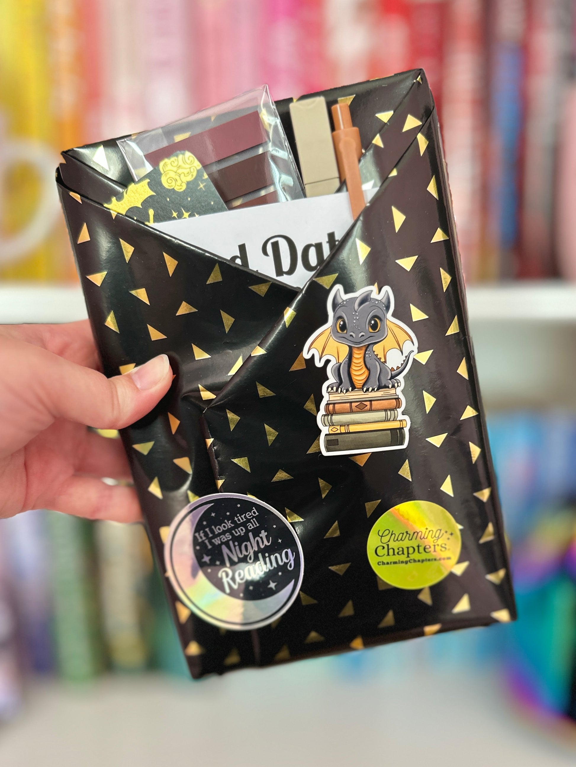 Each BDWAB box includes: a book (or even two!), a bookmark, two vinyl stickers, annotation tab set, pen and highlighter all wrapped in fun decorative paper, PLUS a matching candle!