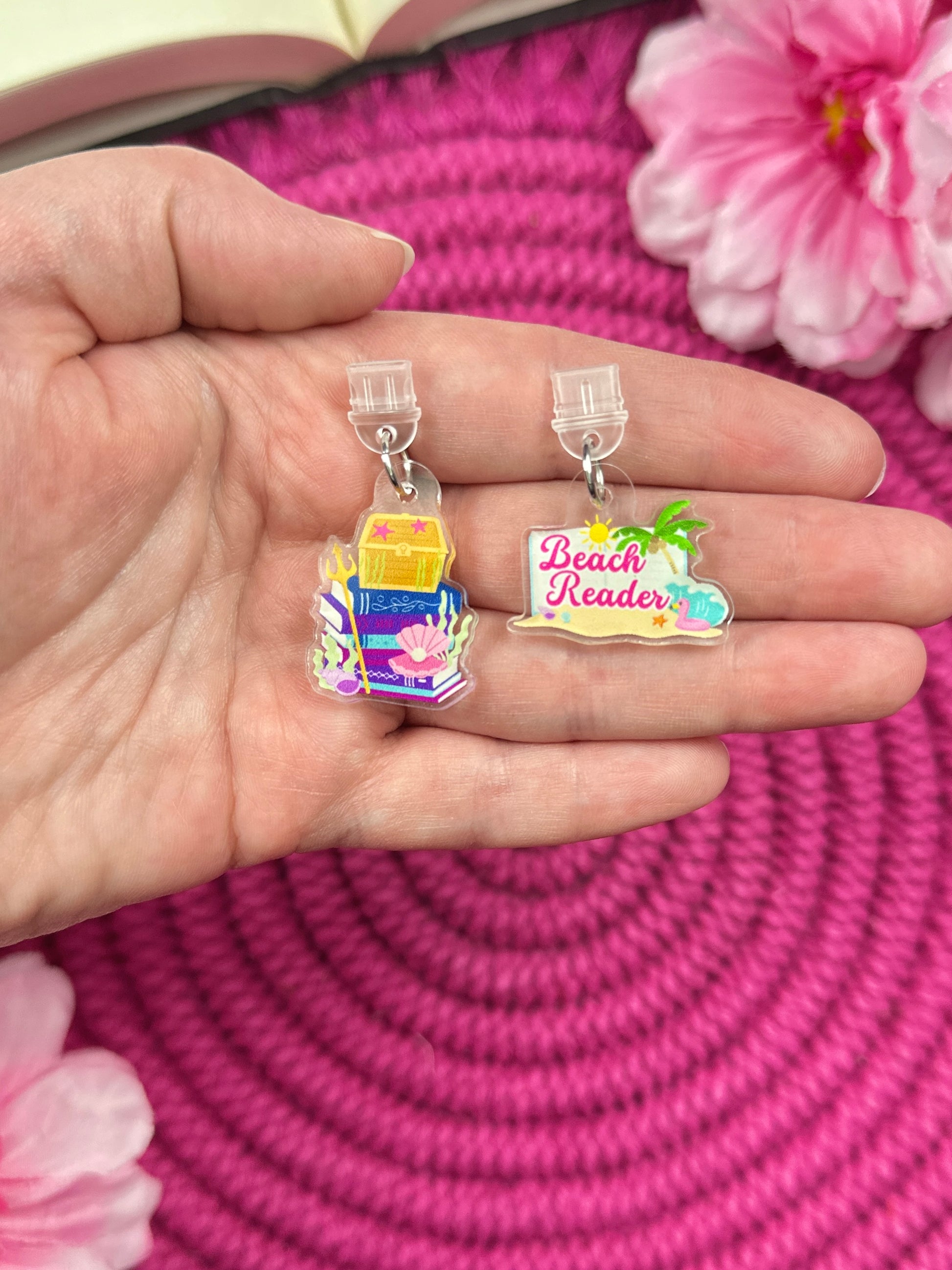 Each acrylic charm is single sided. The beach reader design is approximately 0.75″ x 1.10″ in size, and the ocean bookstack design is approximately .84" x 1.00" in size.