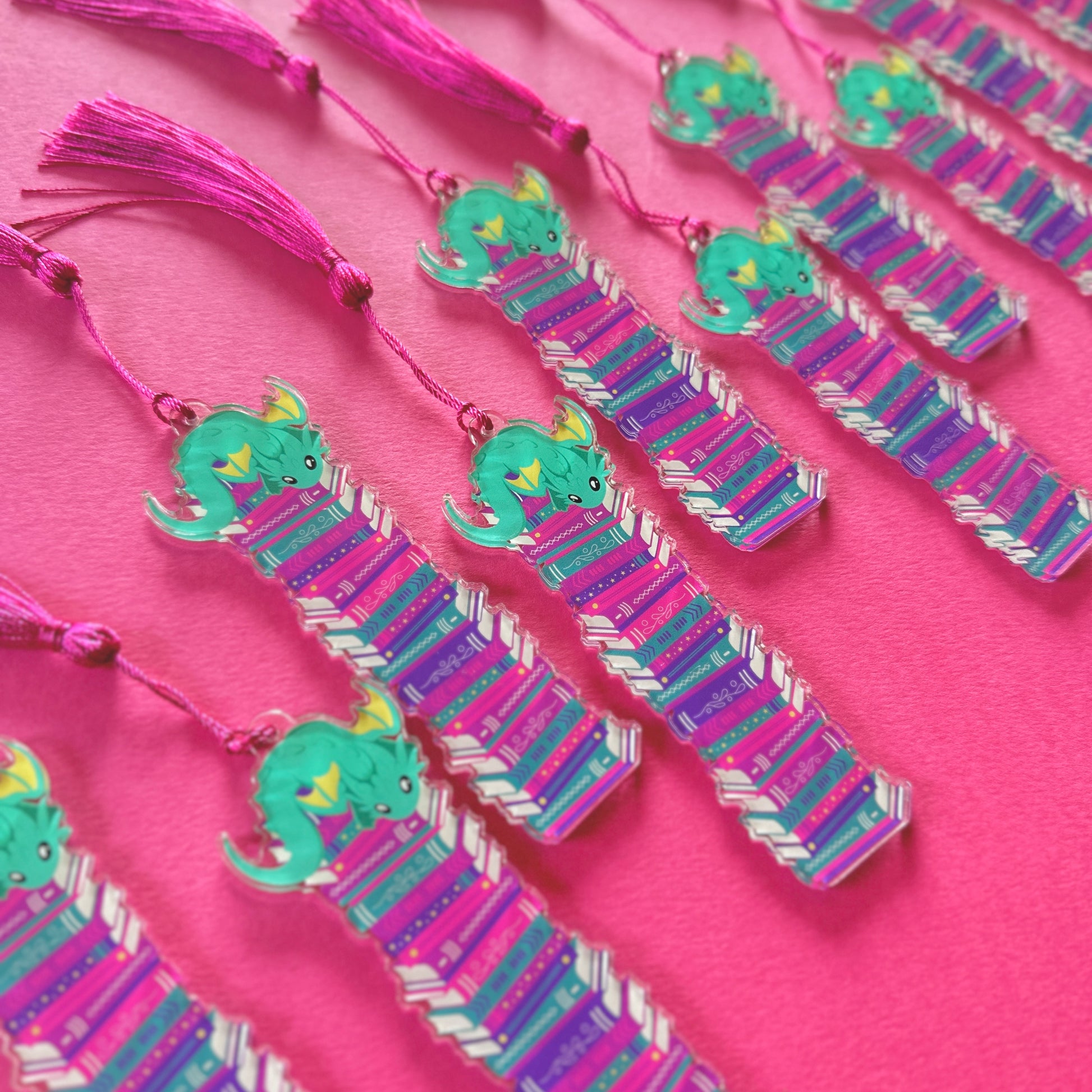 This adorable acrylic bookmark features a dragon sitting on a pile of books, adding a touch of magic to your reading experience. Never lose your spot again when reading your favorite fantasy novels!