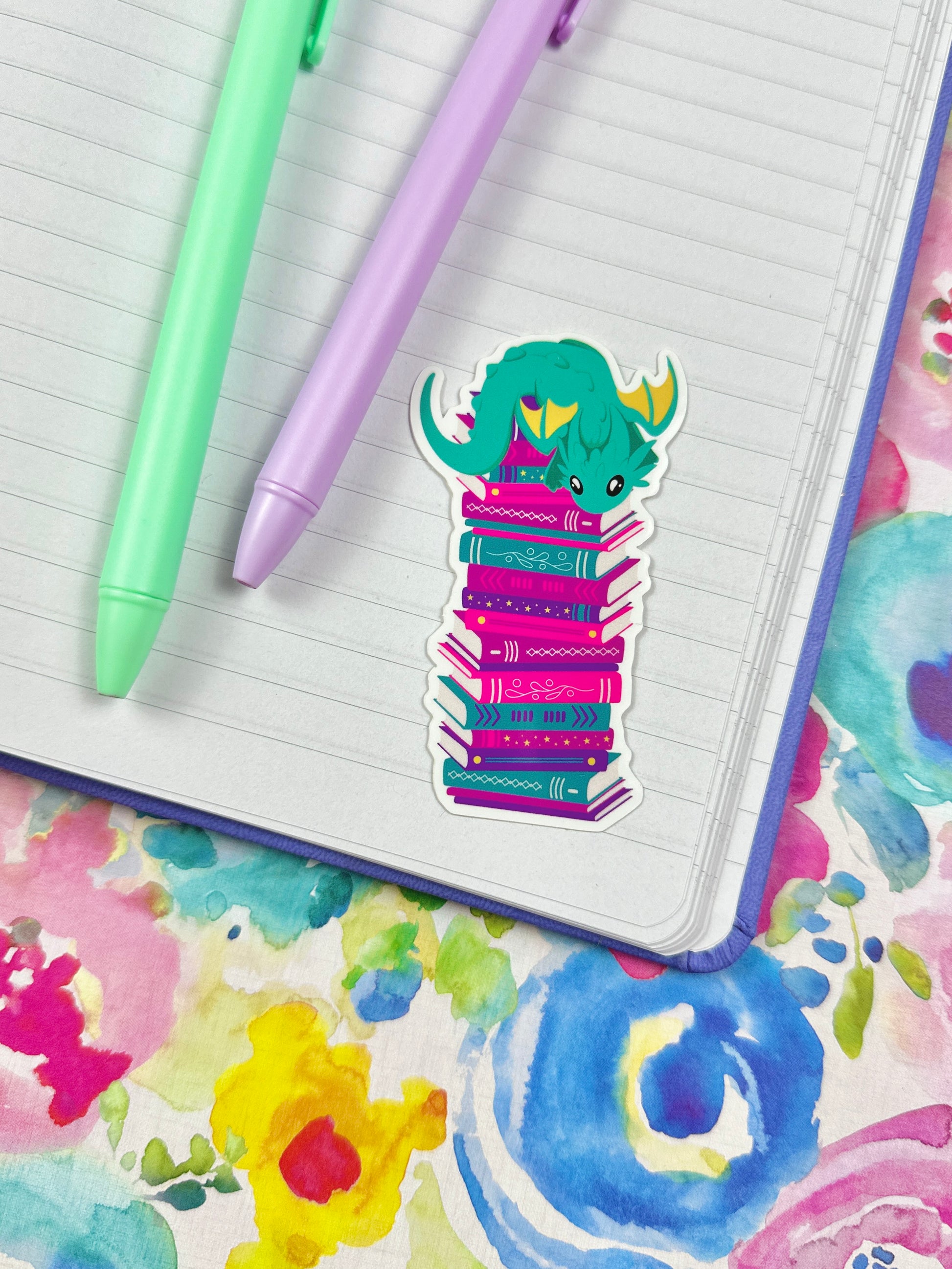 Unleash your inner book dragon with this vinyl sticker! This quirky design features a dragon lounging on a stack of books. It is the perfect way to show off your love for reading in a playful way. Stick it on your Kindle, laptop, water bottle, or anywhere else you want to add a touch of whimsy. (Sorry, no actual dragons included!)