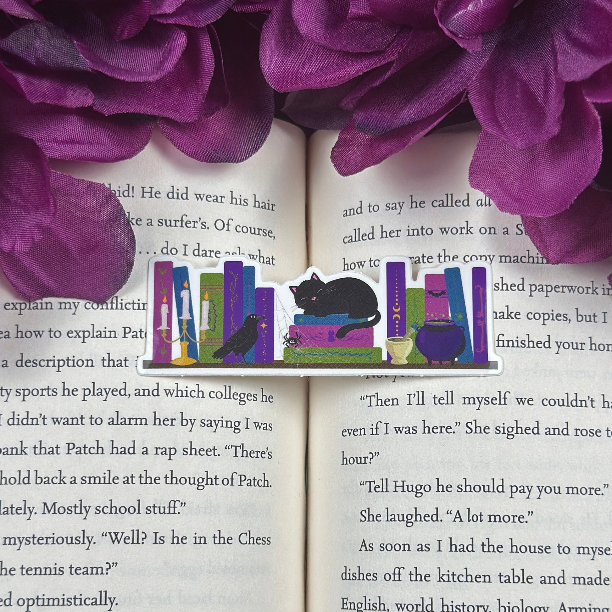 Fall in love with this dark academia bookshelf vinyl sticker! This design features an adorable black cat lounging on a book shelf surrounded by witchy Halloween decorations. It is the perfect way to show off your love for spooky reading sessions. Stick it on your favorite reading accessories to add a touch of magic.