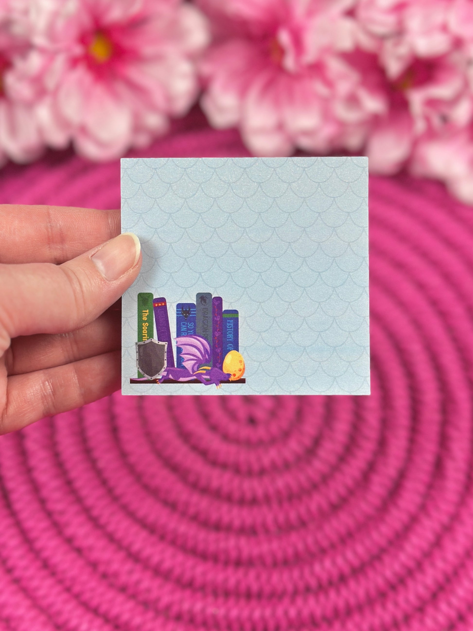 Indulge the bibliophile in your life with this dragon rider bookshelf-themed notepad! It is perfect for jotting down book ideas, notes, to-do lists, and favorite quotes! These notepads make great gifts for fantasy book lovers, teachers, writers and more!