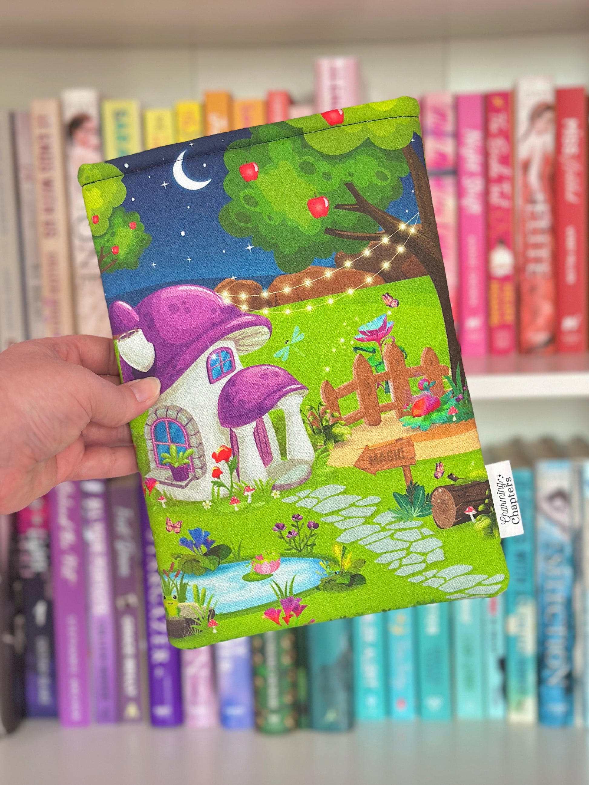 This book sleeve's pattern features a nighttime enchanted garden reading nook design. This sleeve also has a matching solid dark blue inside lining.