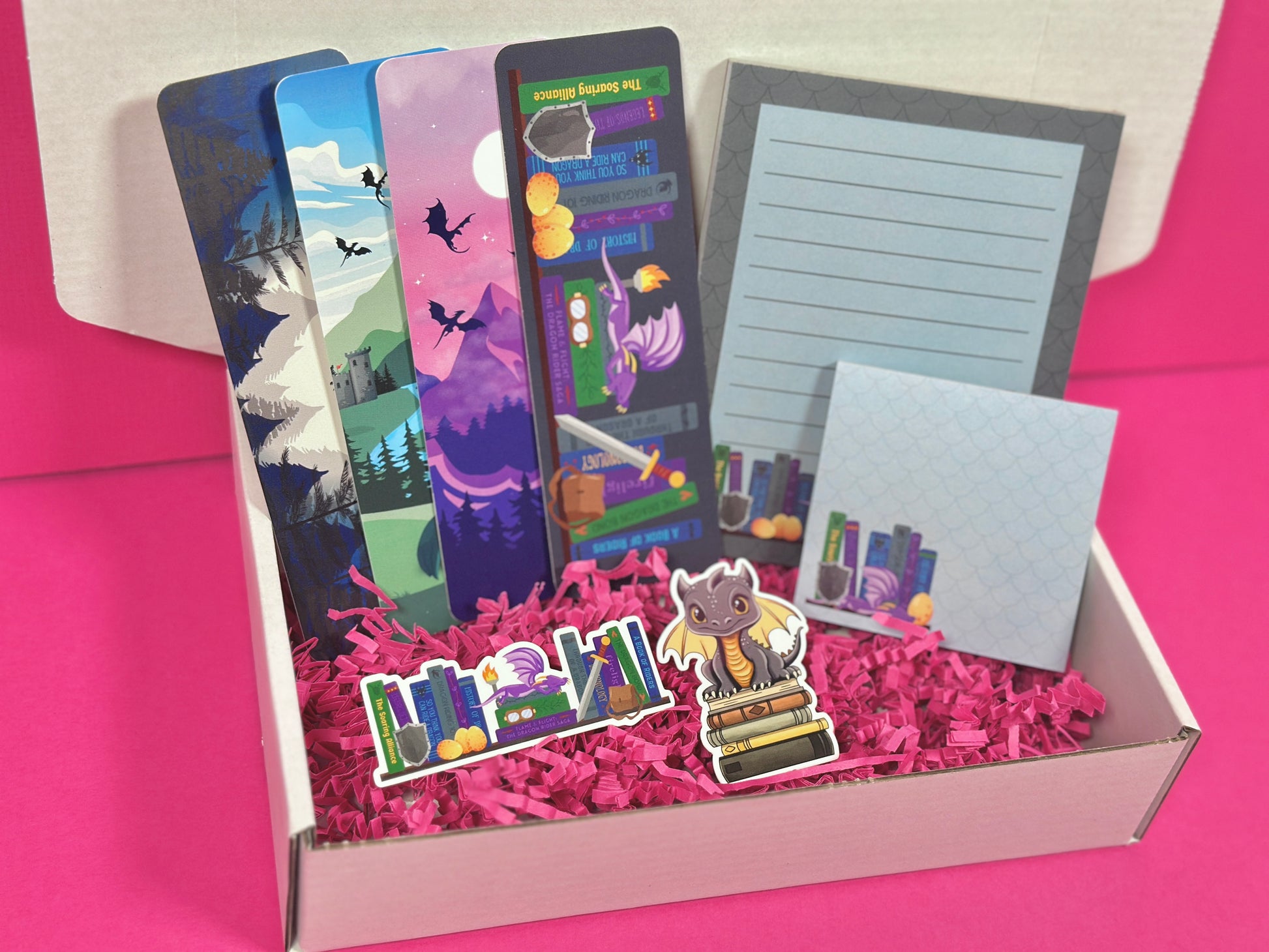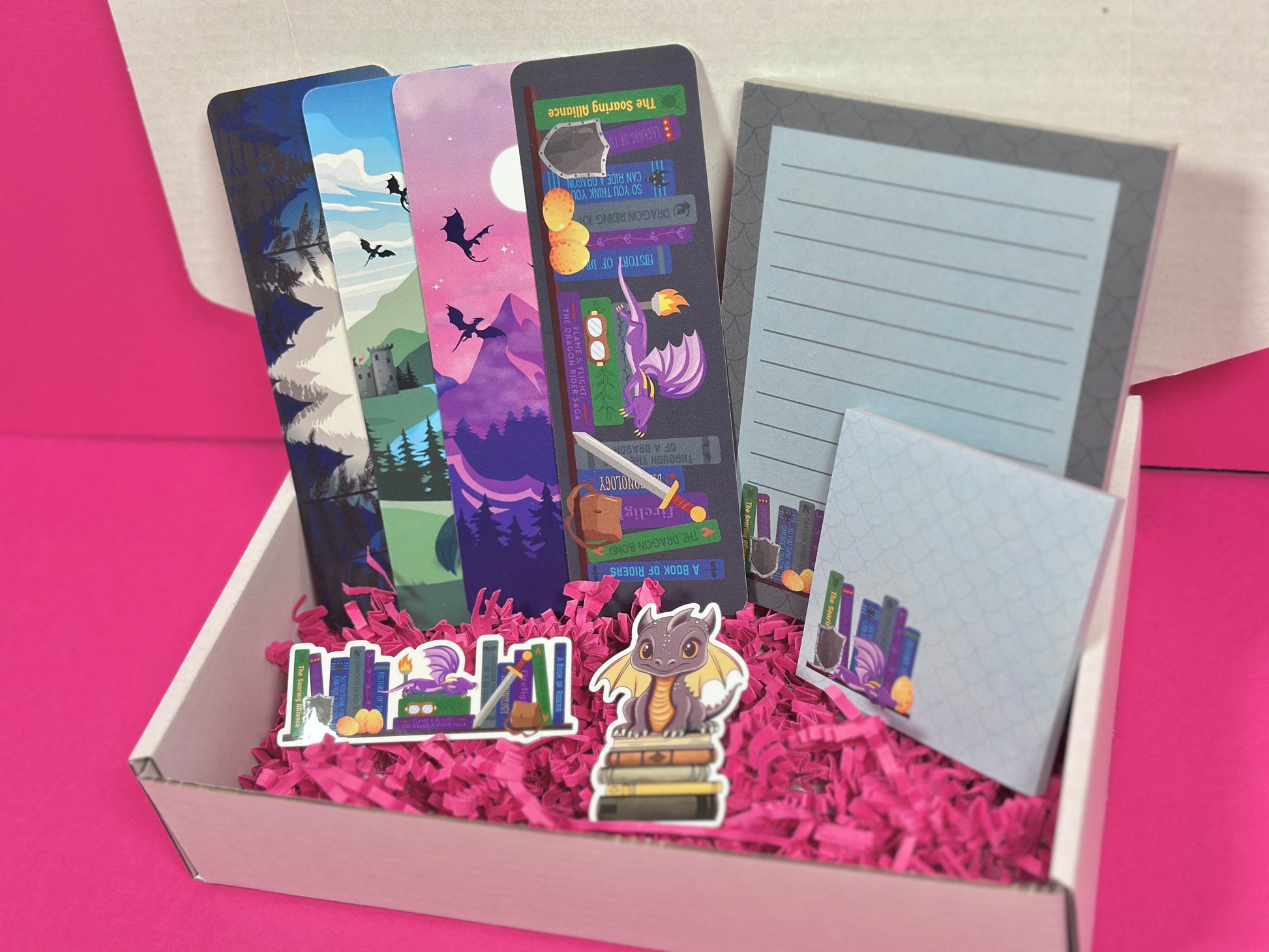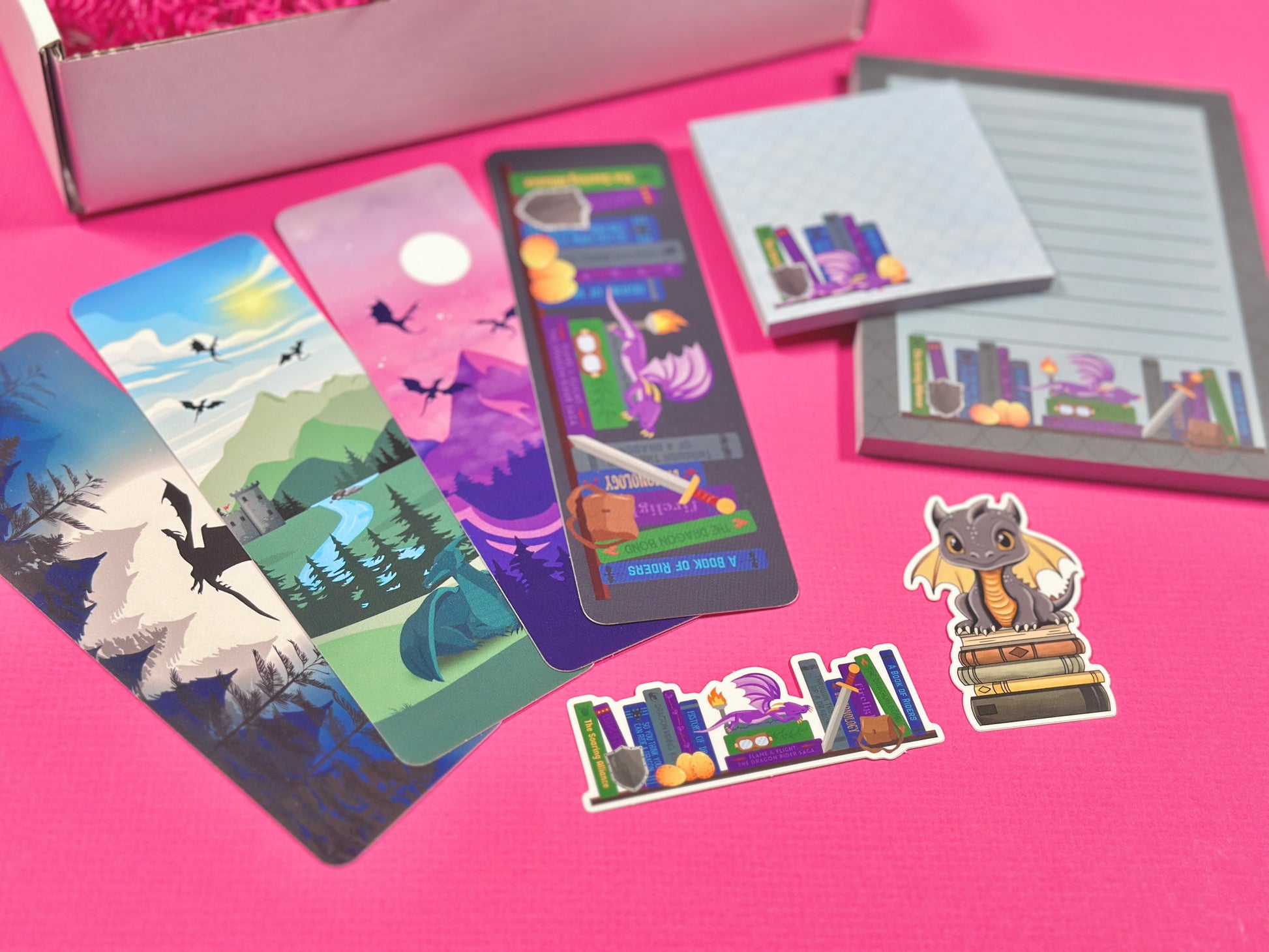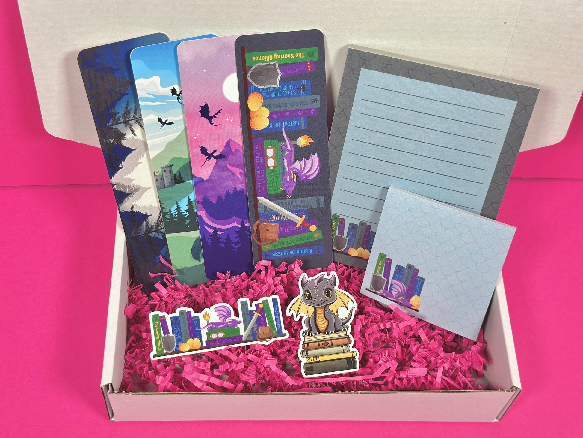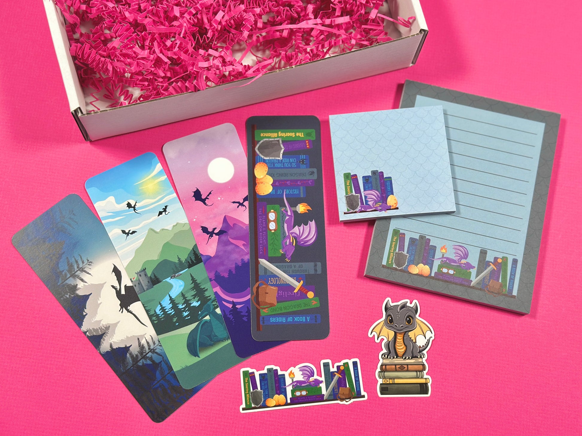 Unleash your inner dragon with this enchanting stationery set! Perfect for journaling, note-taking, and creative projects, this collection features a notepad for capturing your thoughts, colorful sticky notes for quick reminders, four beautifully designed bookmarks to mark your place in epic tales, and two dragon-themed stickers to personalize your belongings. Whether you're a fantasy fan, avid reader, or stationery enthusiast, this set brings a touch of mythical magic to your everyday writing and organizing. A delightful gift for dragon devotees of all ages!