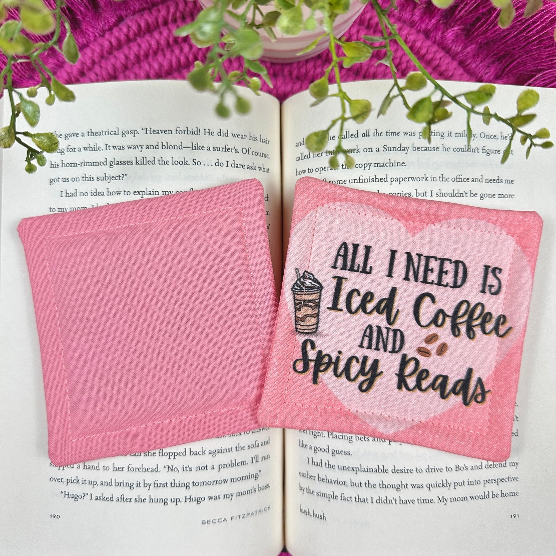 The pattern on this mug rug features an "All I need is iced coffee & spicy reads" design on a pink background. The mug rug also has a solid pink backing.