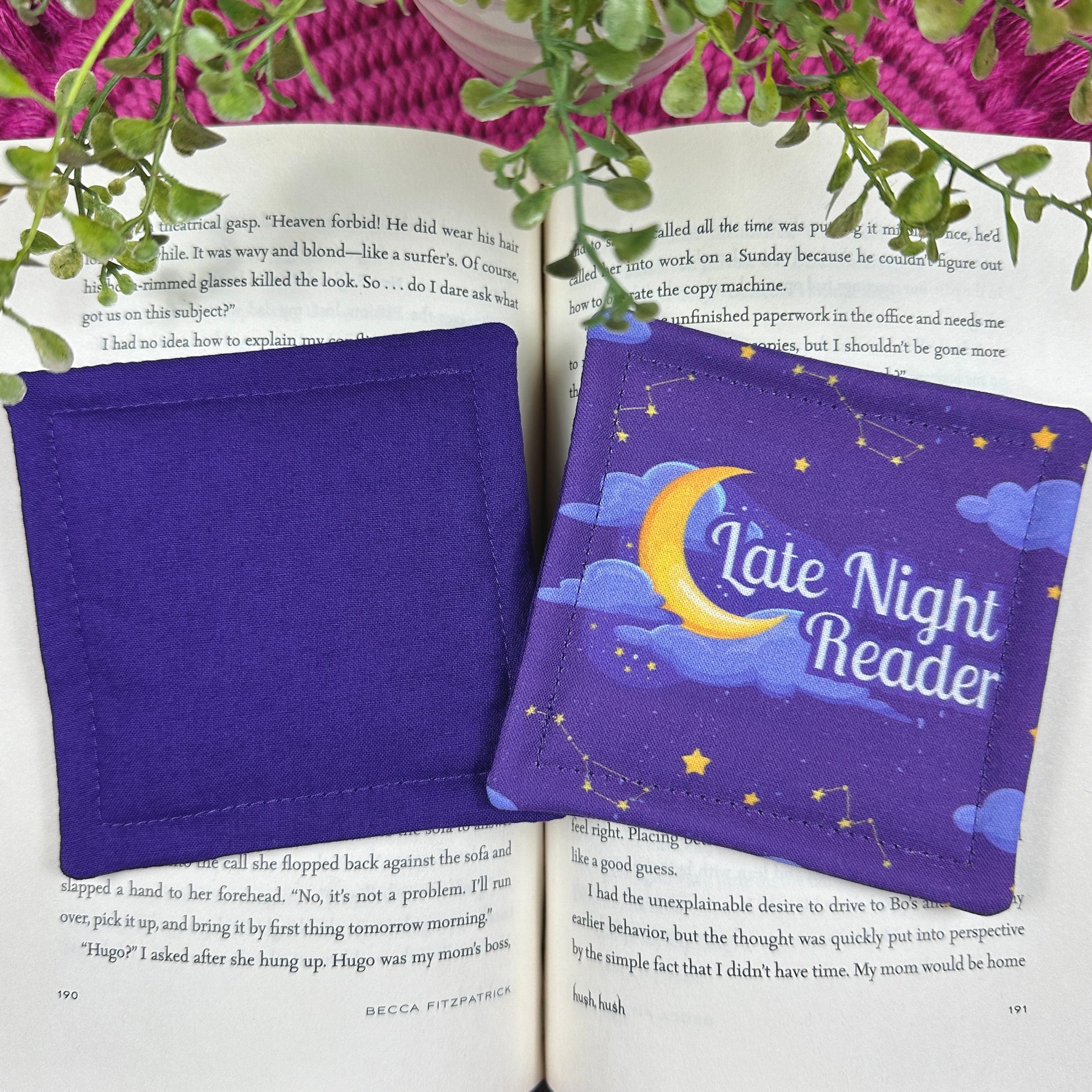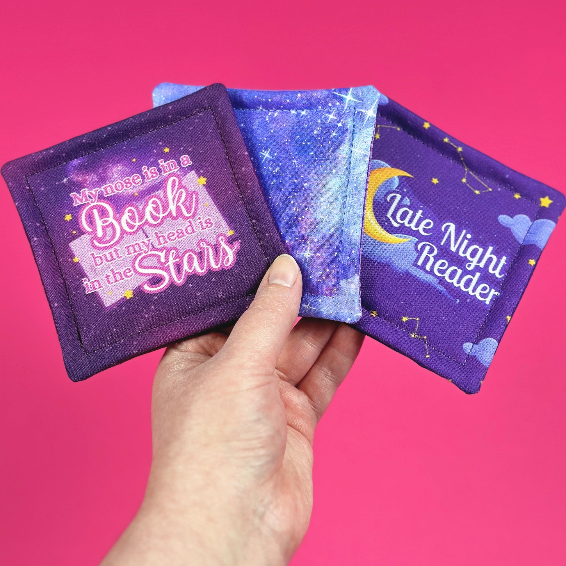 The pattern on this mug rug features a celestial late night reader design. The mug rug also has a solid purple-blue backing.
