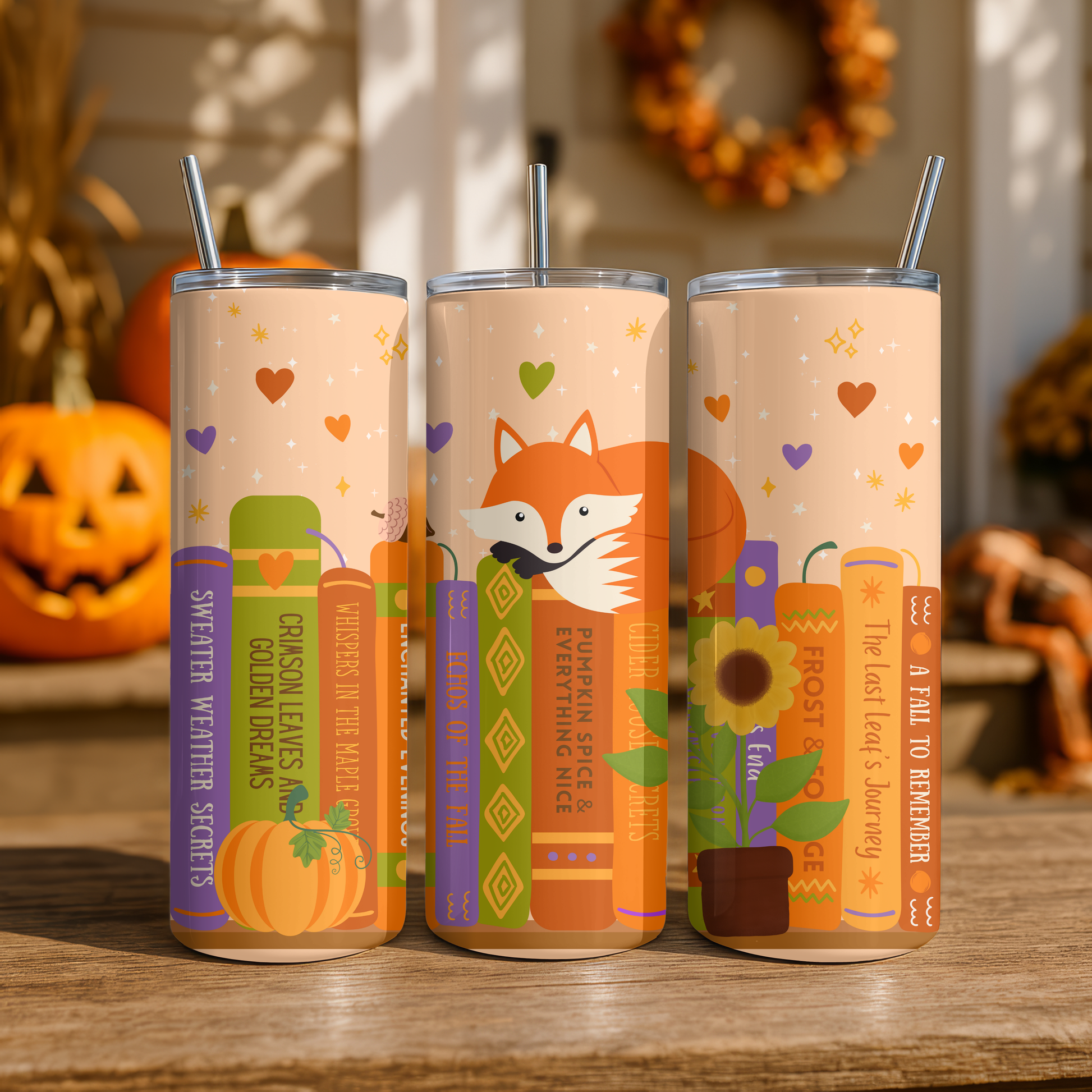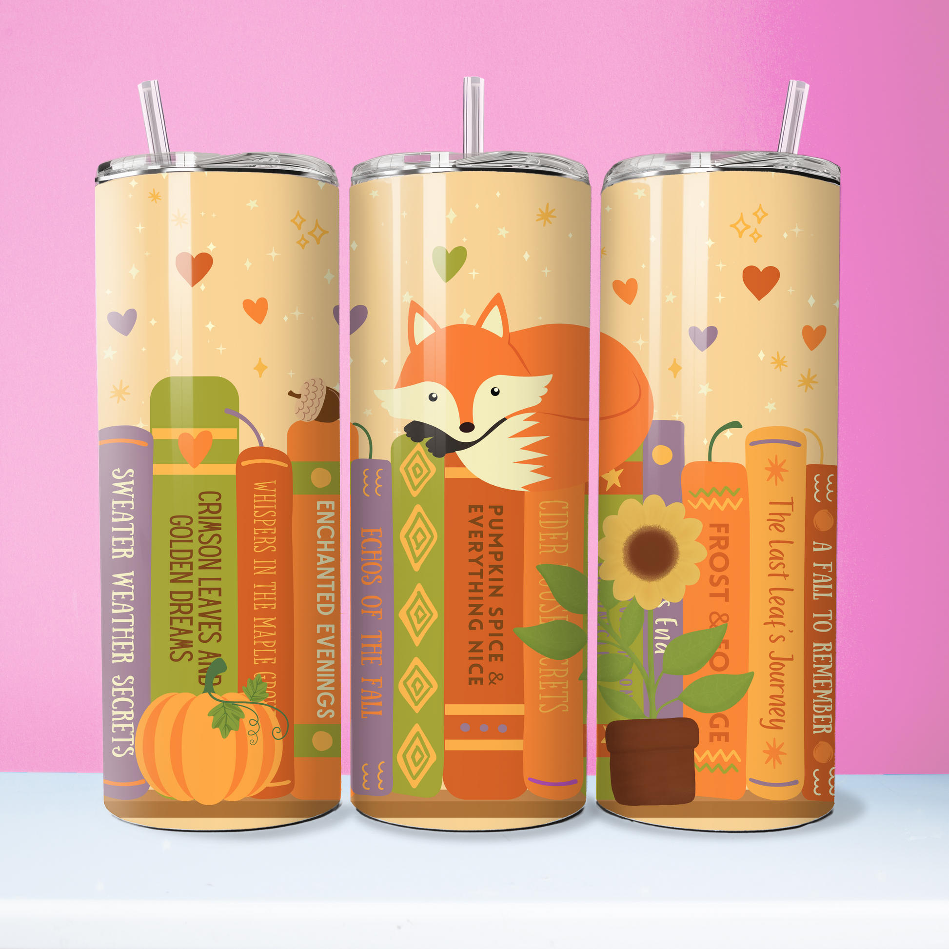 Get cozy with this autumn bookshelf tumbler! Sip your favorite beverage while enjoying the beautiful fall leaves and your favorite reads. With its slim design, it's easy to carry and will keep your drinks at the perfect temperature for hours. It is great for both hot and cold beverages and comes with a clear plastic lid, clear plastic straw and care instruction card. Perfect for book lovers and those looking to add a touch of autumn to their daily routine. Only available for a limited time, so don't miss out!