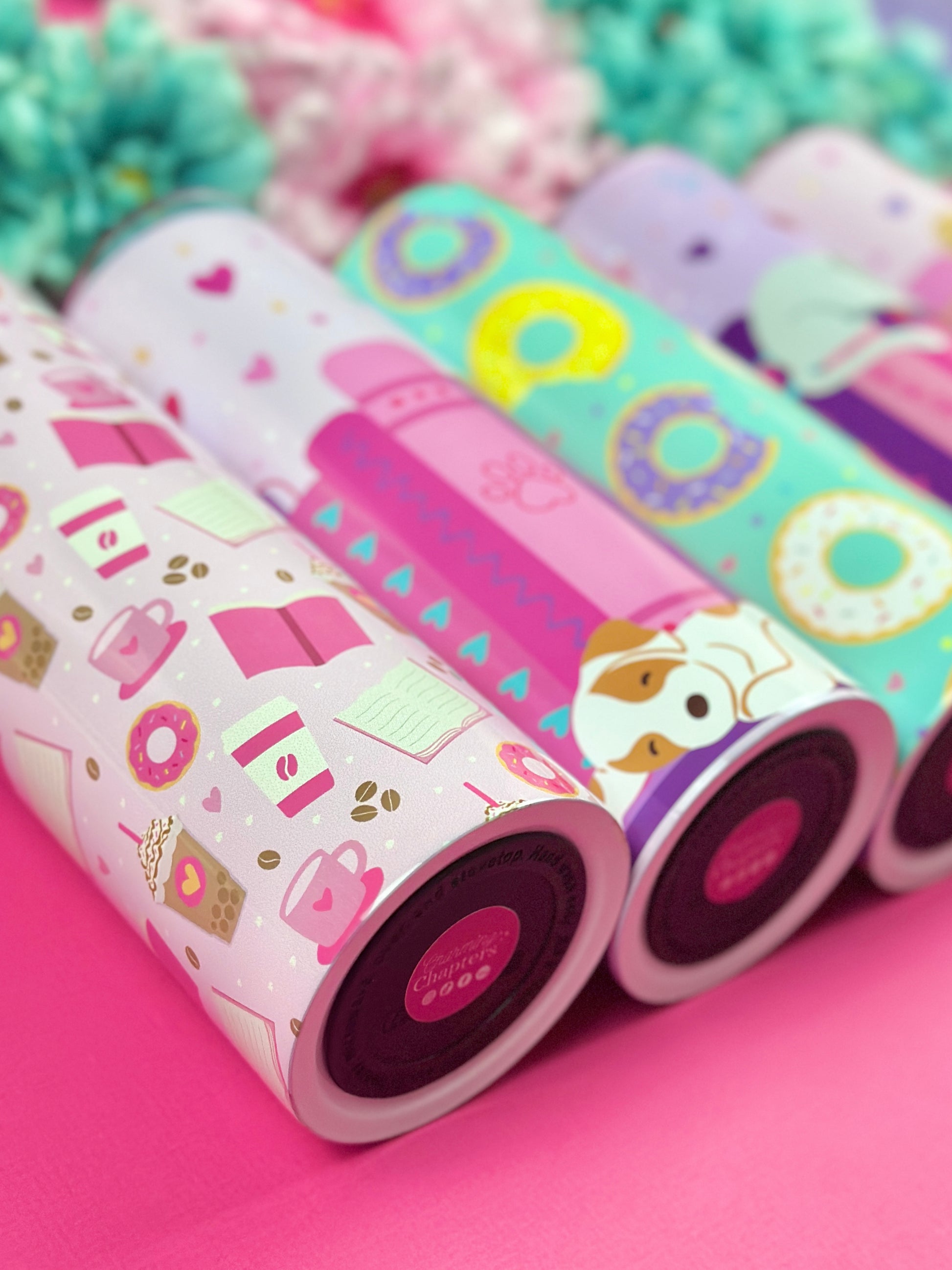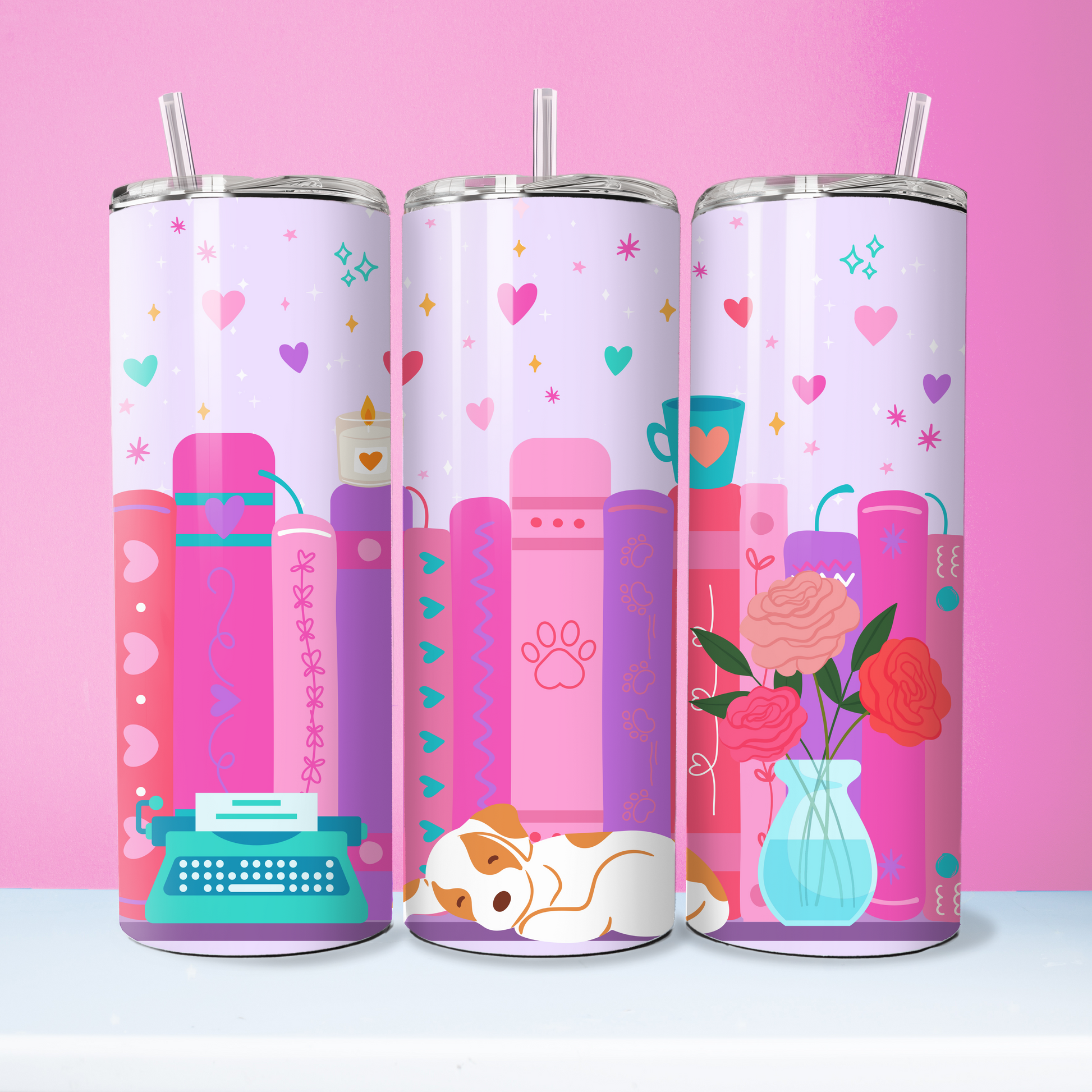 This 20 oz skinny tumbler features a dog lover bookshelf design. It is perfect for the bookworm in your life. With its slim design, it's easy to carry and will keep your drinks at the perfect temperature for hours. It is great for both hot and cold beverages and comes with a clear plastic lid, clear plastic straw and care instruction card. Stay hydrated and stylish with this cute bookish tumbler.