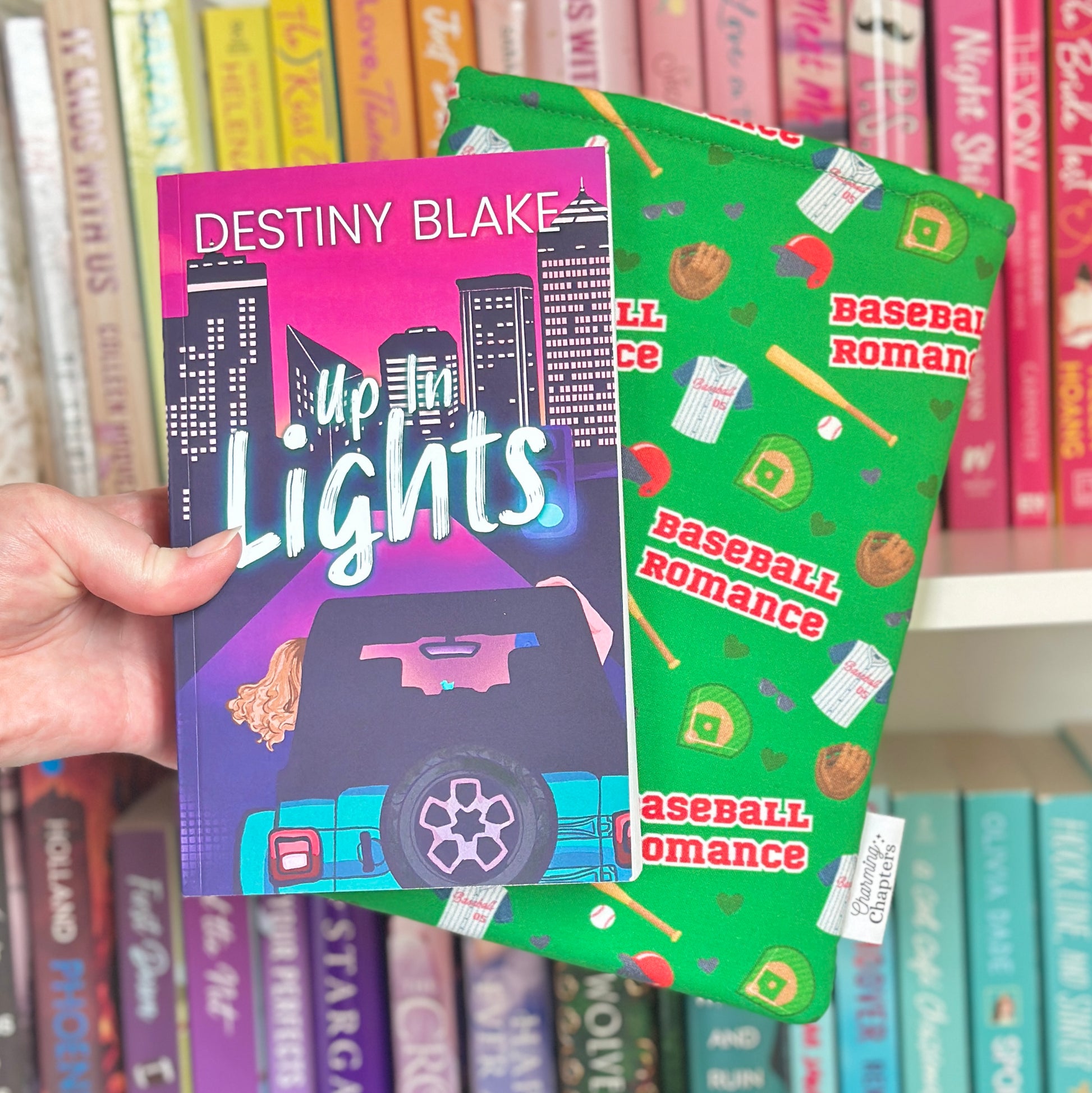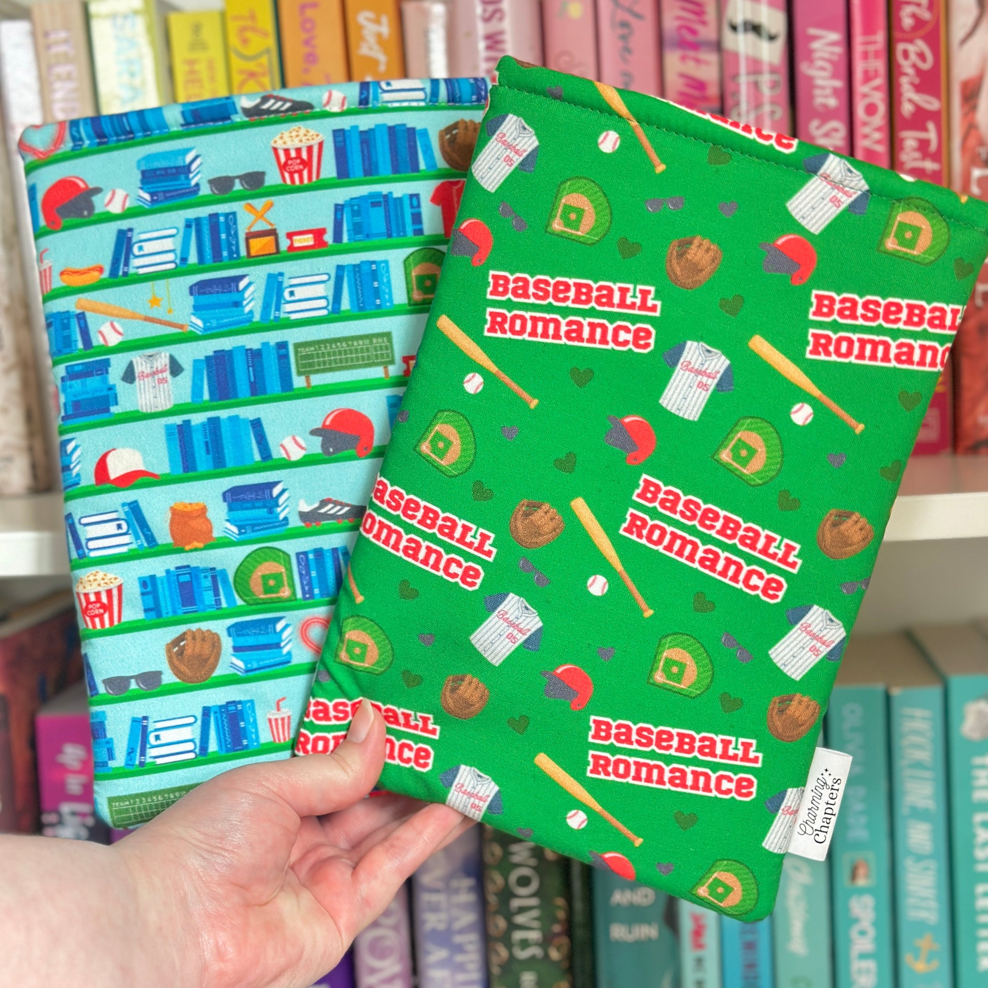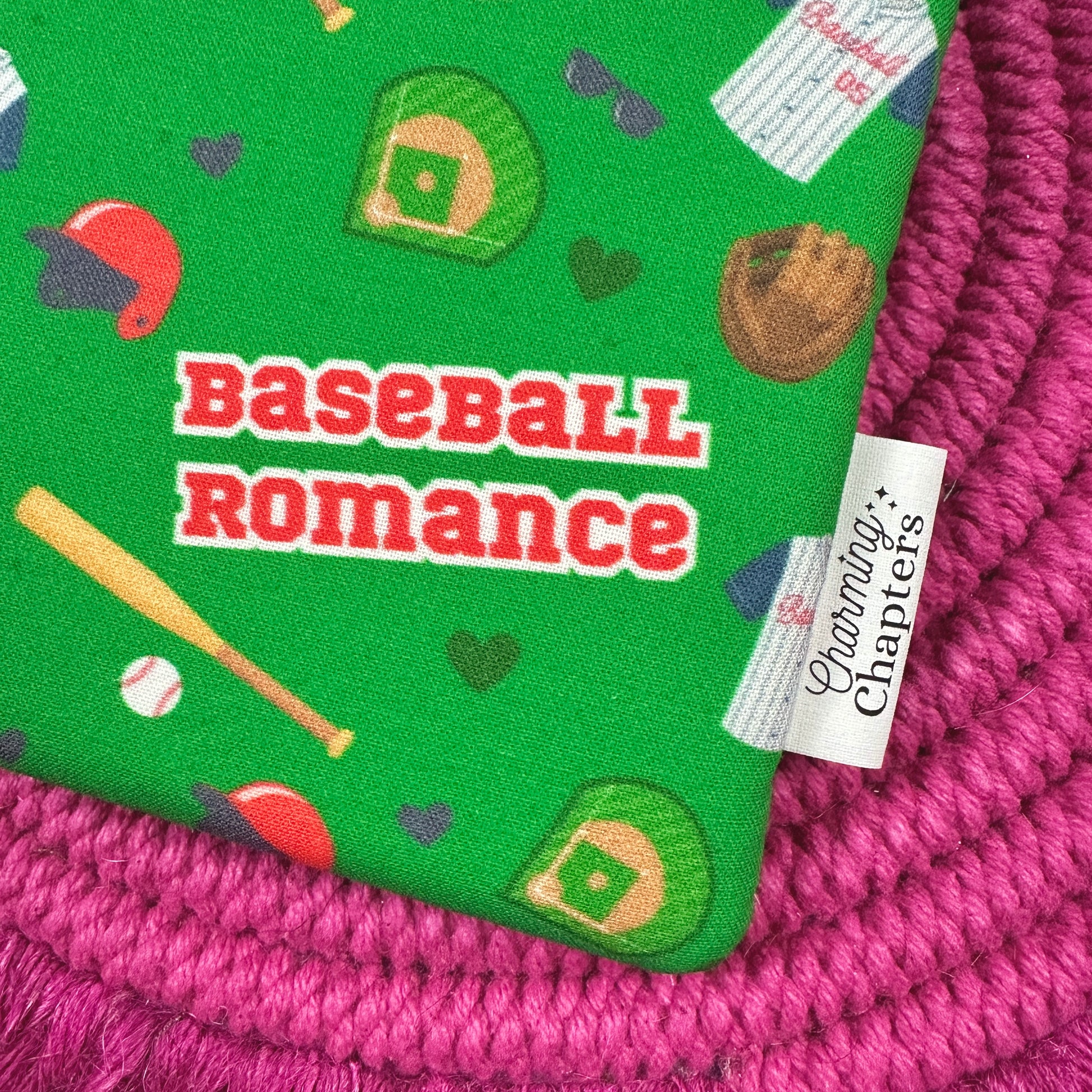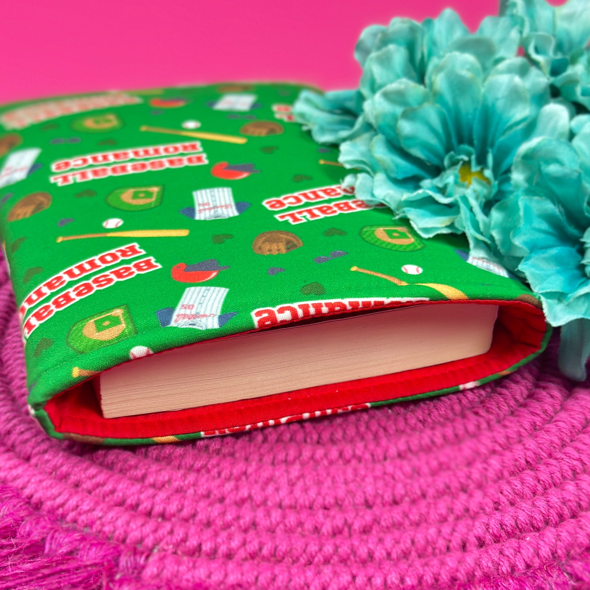 This book sleeve's pattern features a baseball romance design. This sleeve also has a matching solid red inside lining.