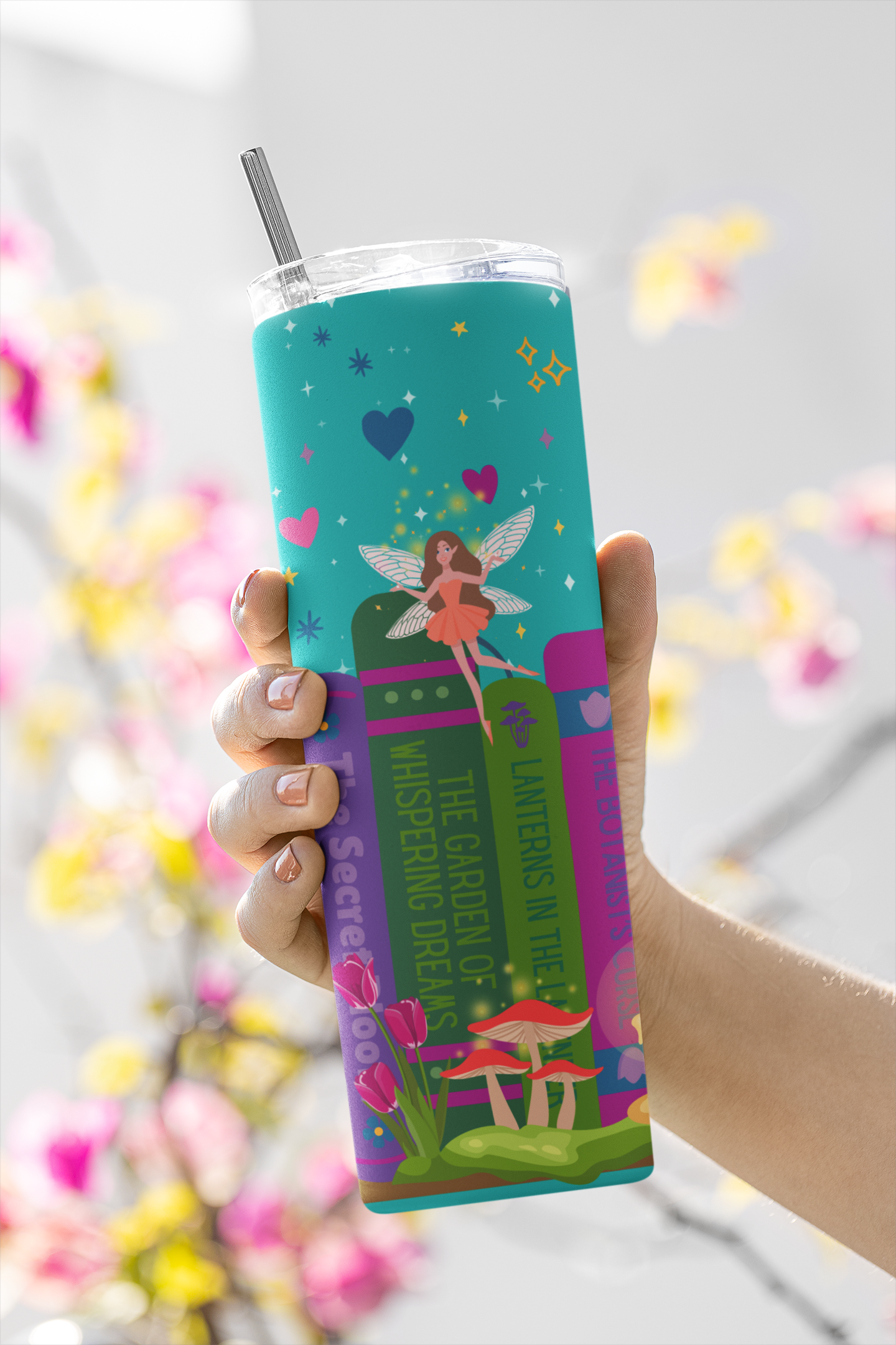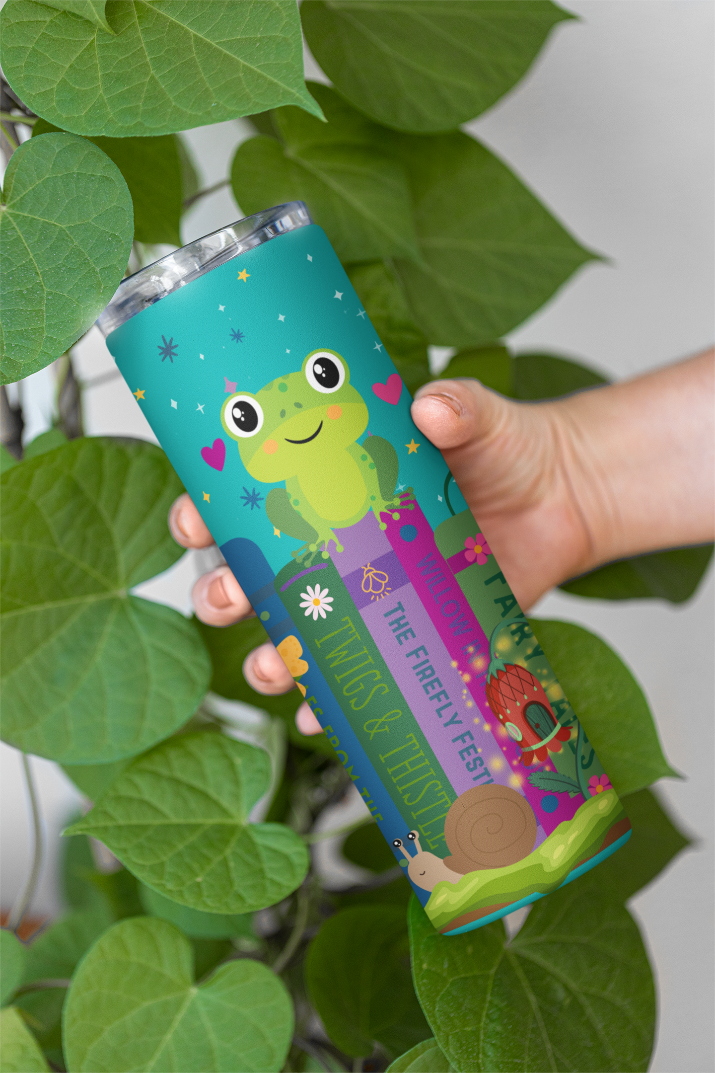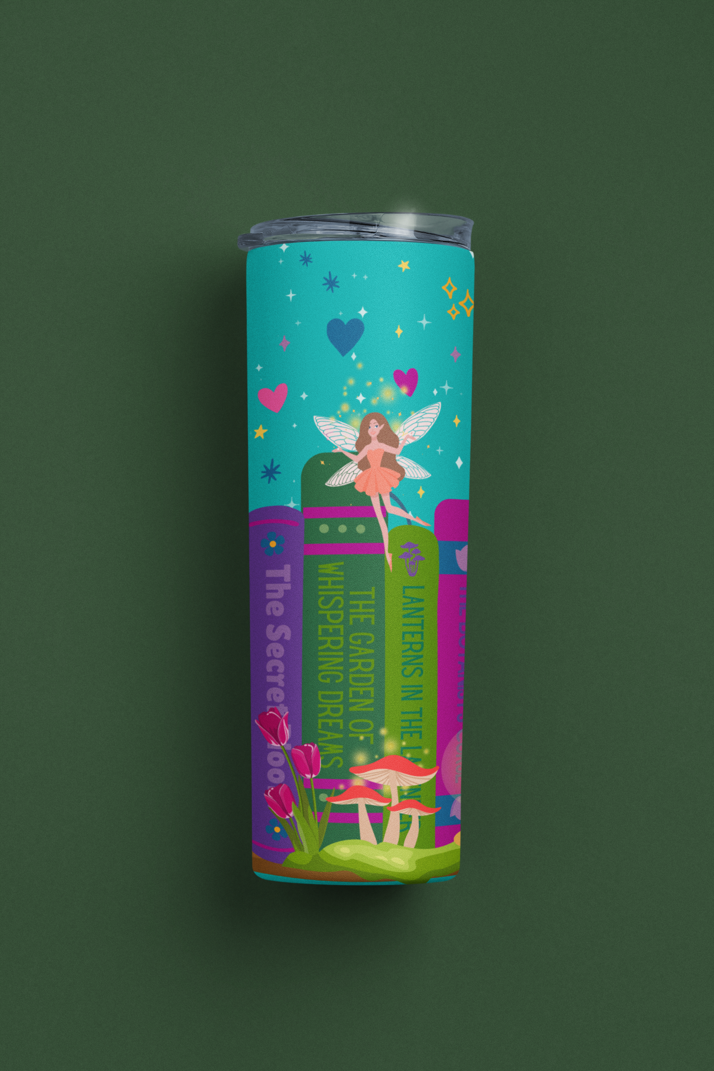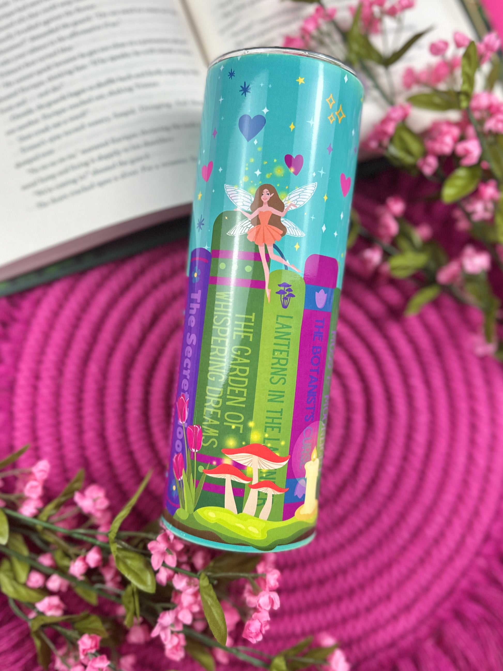 This 20 oz skinny tumbler features an enchanted garden bookshelf design with mushrooms, fairies and even a frog! It is perfect for the fairytale-loving bookworm in your life. With its slim design, it's easy to carry and will keep your drinks at the perfect temperature for hours. It is great for both hot and cold beverages and comes with a clear plastic lid, clear plastic straw and care instruction card. Stay hydrated and stylish with this cute bookish tumbler.