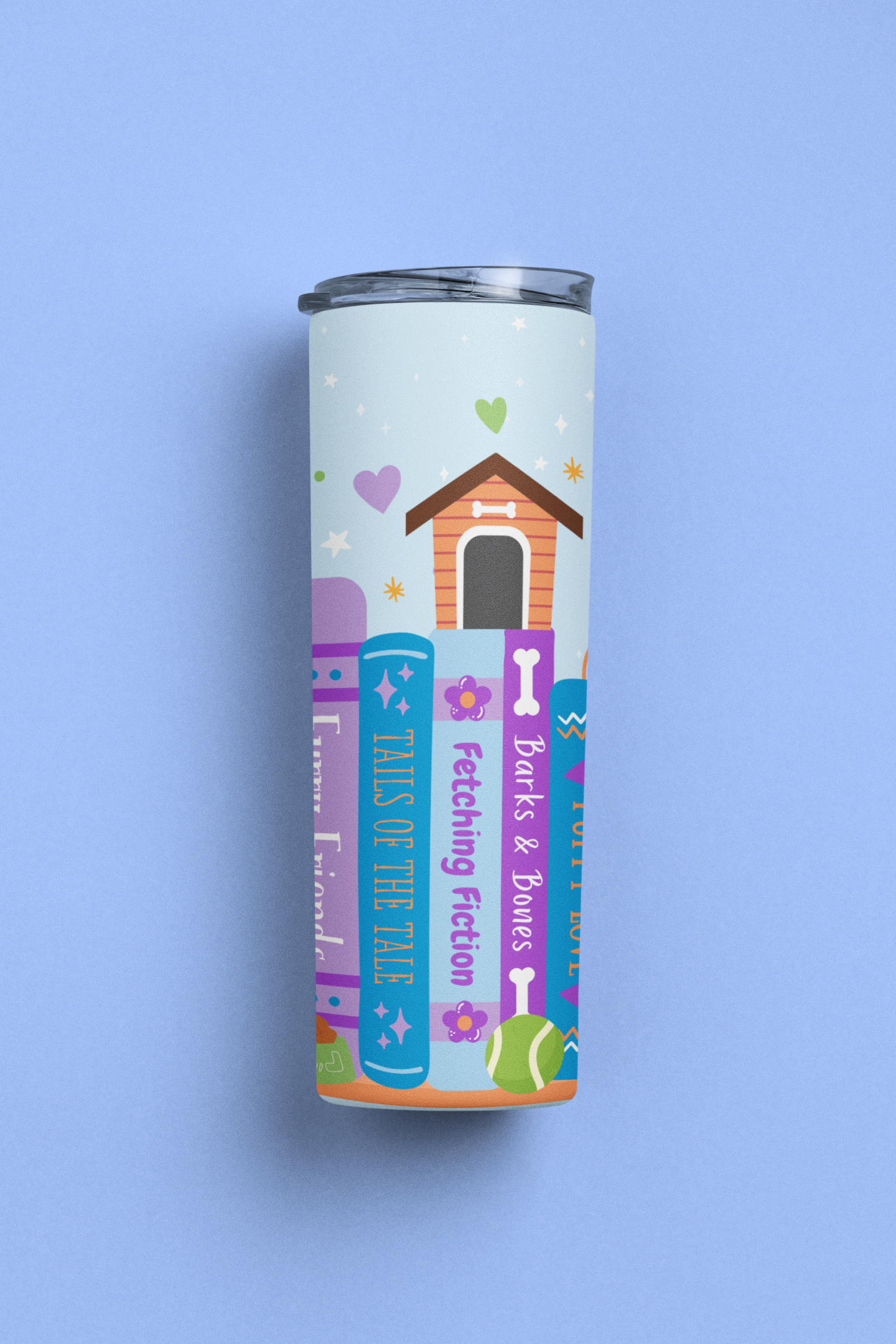 This 20 oz skinny tumbler features a dog lover design filled with dog toys, treats, and even a dog house! It is perfect for the dog-loving bookworm in your life. With its slim design, it's easy to carry and will keep your drinks at the perfect temperature for hours. It is great for both hot and cold beverages and comes with a clear plastic lid, clear plastic straw and care instruction card. Stay hydrated and stylish with this cute bookish tumbler.