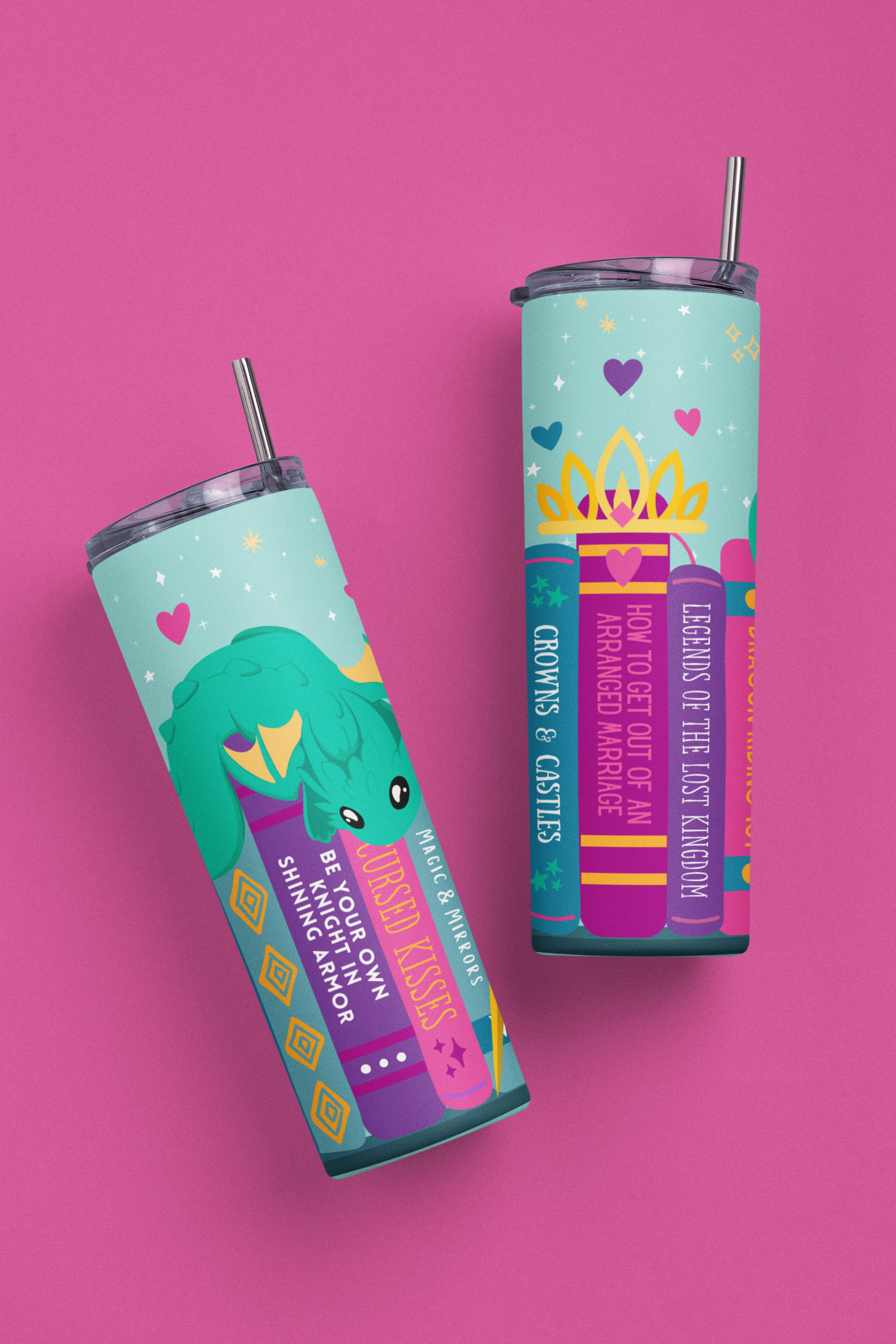 This 20 oz skinny tumbler features a romantasy reader design with a crown, sword and even a dragon! It is perfect for the bookworm in your life. With its slim design, it's easy to carry and will keep your drinks at the perfect temperature for hours. It is great for both hot and cold beverages and comes with a clear plastic lid, clear plastic straw and care instruction card. Stay hydrated and stylish with this cute bookish tumbler.