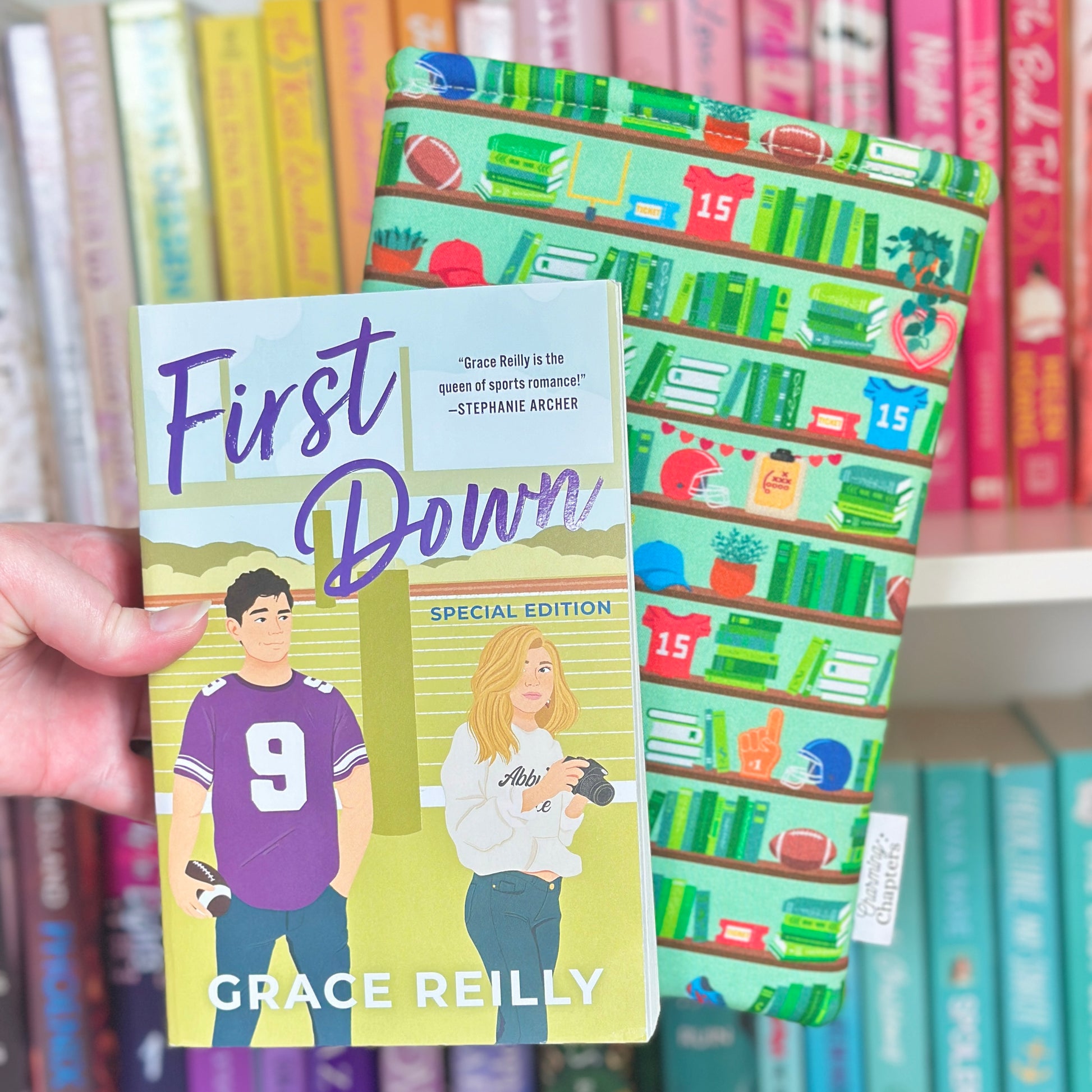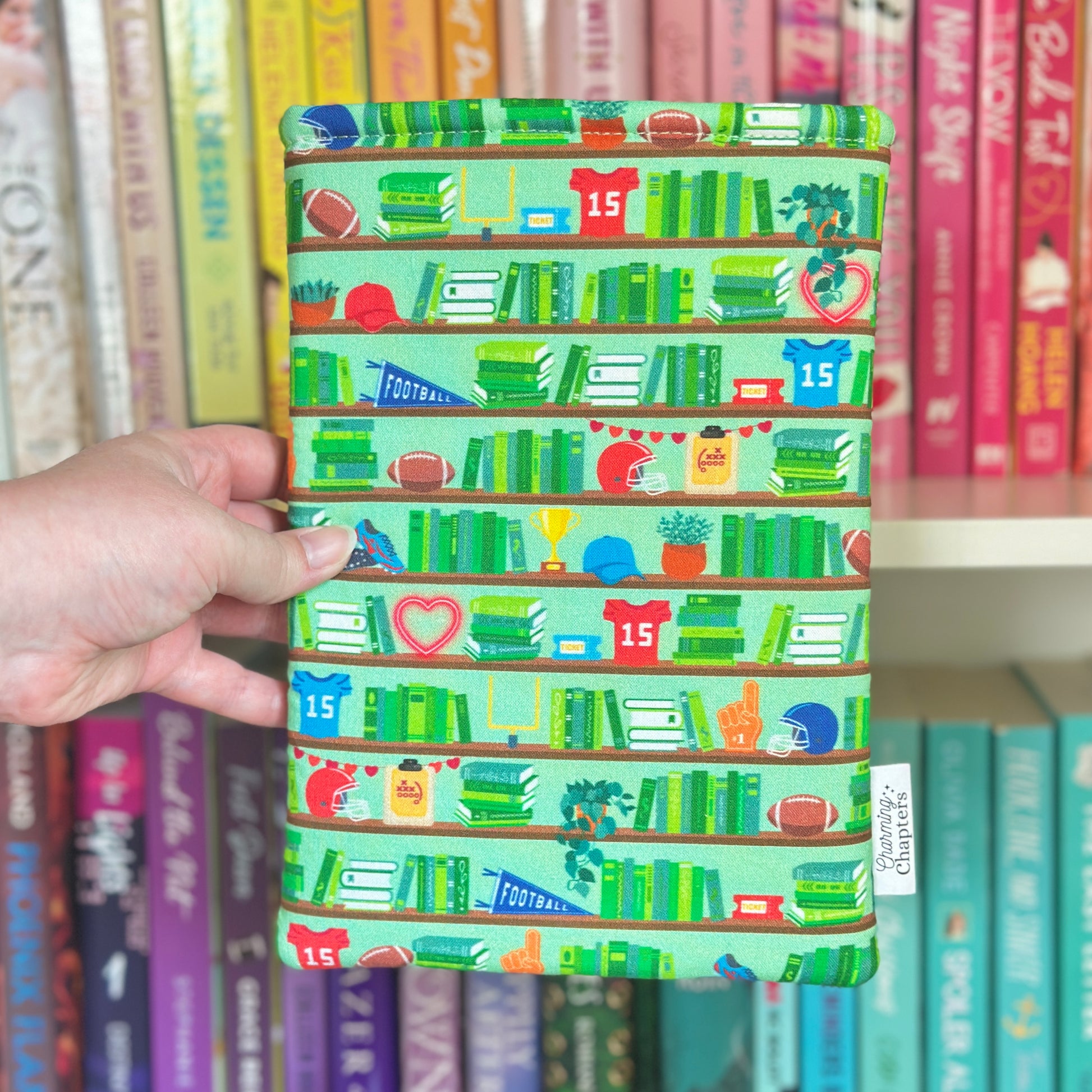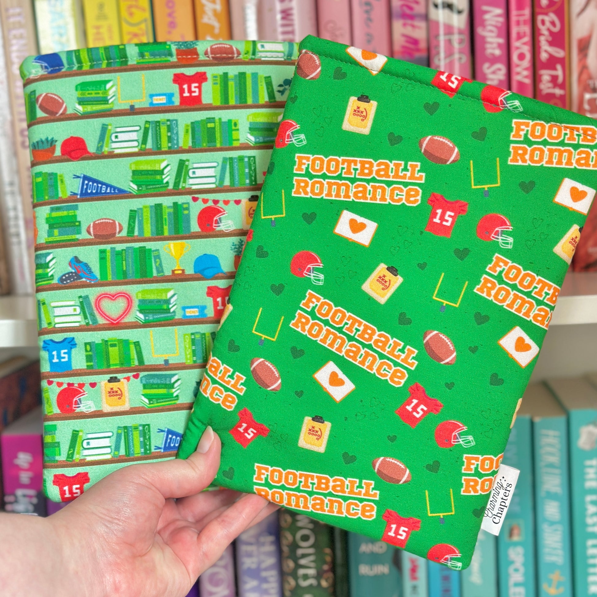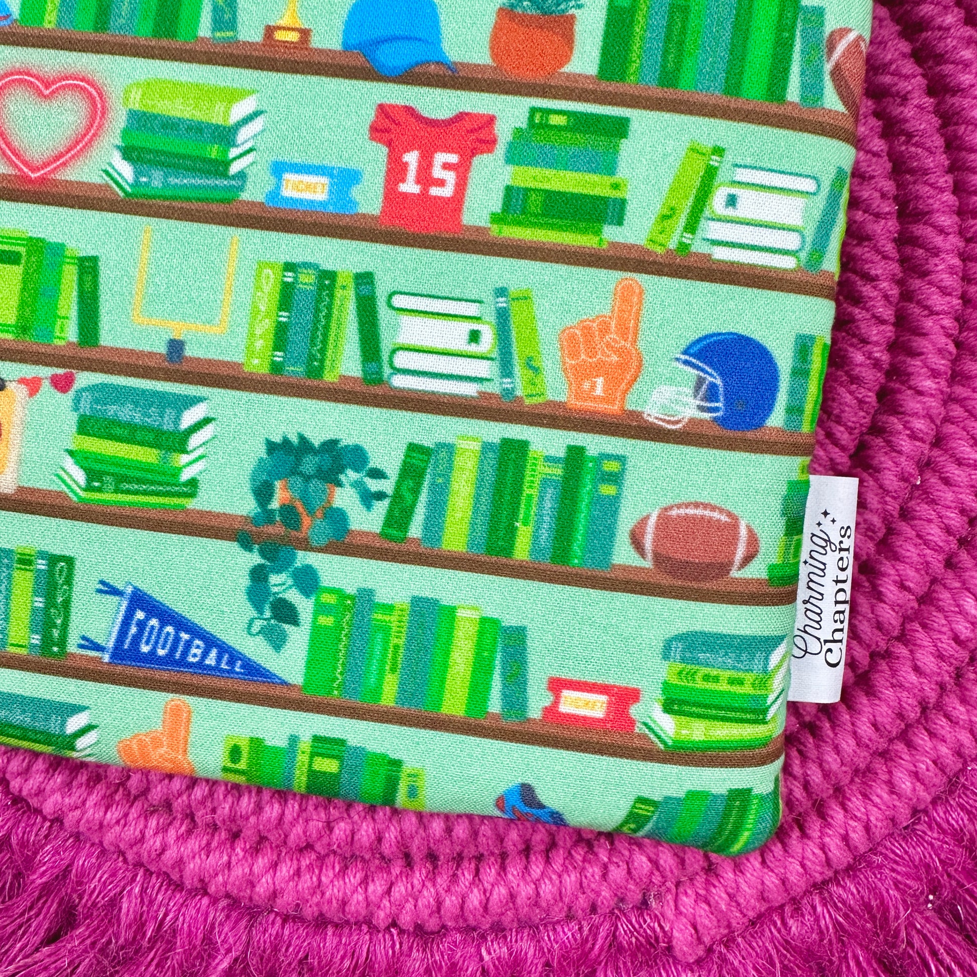 This book sleeve's pattern features a football romance book shelf design. This sleeve also has a matching solid green inside lining.