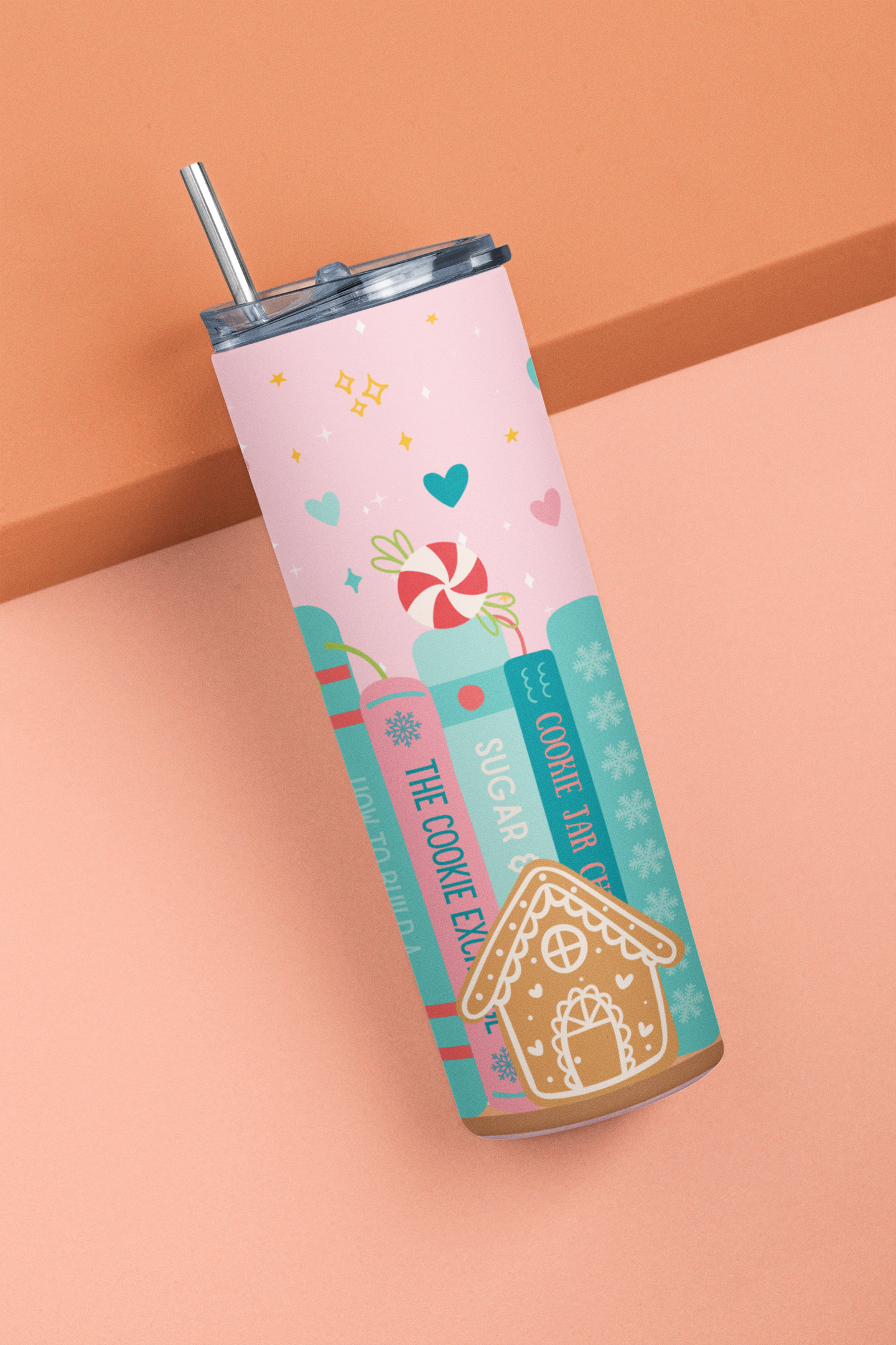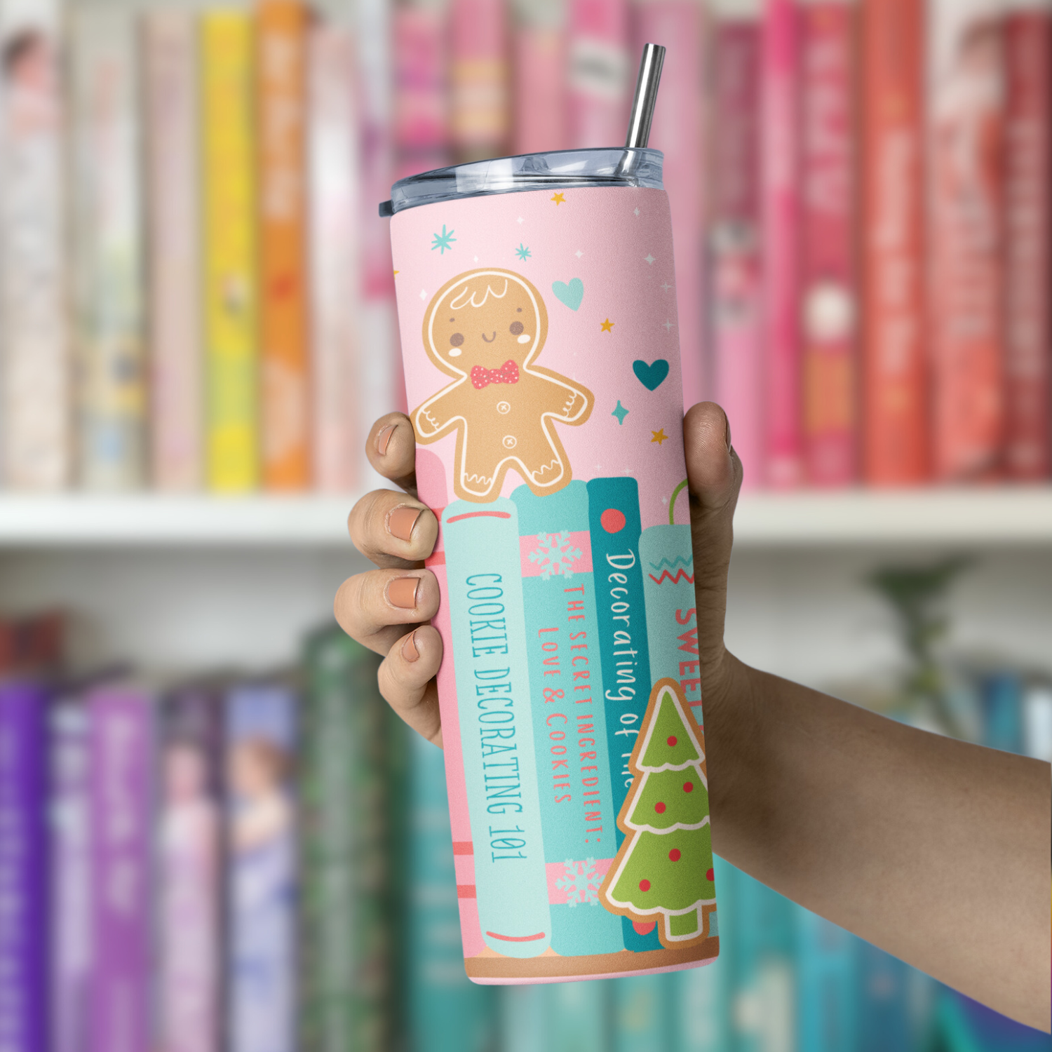 This 20 oz skinny tumbler features a gingerbread bookshelf design with a variety of baked items including a gingerbread man, house, and Christmas Tree. It is perfect for the bookworm in your life. With its slim design, it's easy to carry and will keep your drinks at the perfect temperature for hours. It is great for both hot and cold beverages and comes with a clear plastic lid, clear plastic straw and care instruction card. Stay hydrated and stylish with this cute bookish tumbler.
