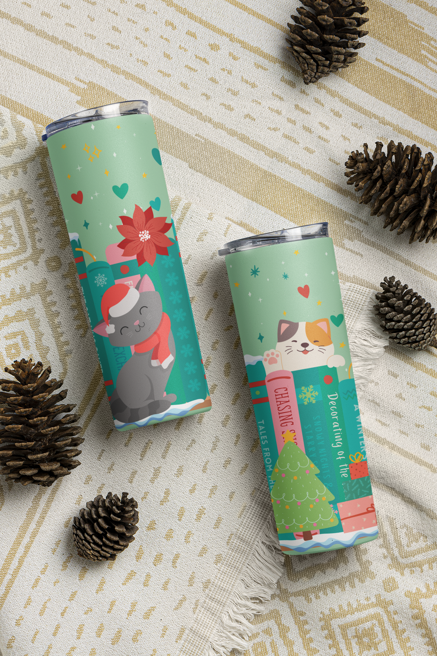 This 20 oz skinny tumbler features a winter bookshelf design with a variety of Christmas decorations including adorable cats, poinsettia, and holiday ornaments! It is perfect for the bookworm in your life. With its slim design, it's easy to carry and will keep your drinks at the perfect temperature for hours. It is great for both hot and cold beverages and comes with a clear plastic lid, clear plastic straw and care instruction card. Stay hydrated and stylish with this cute bookish tumbler.