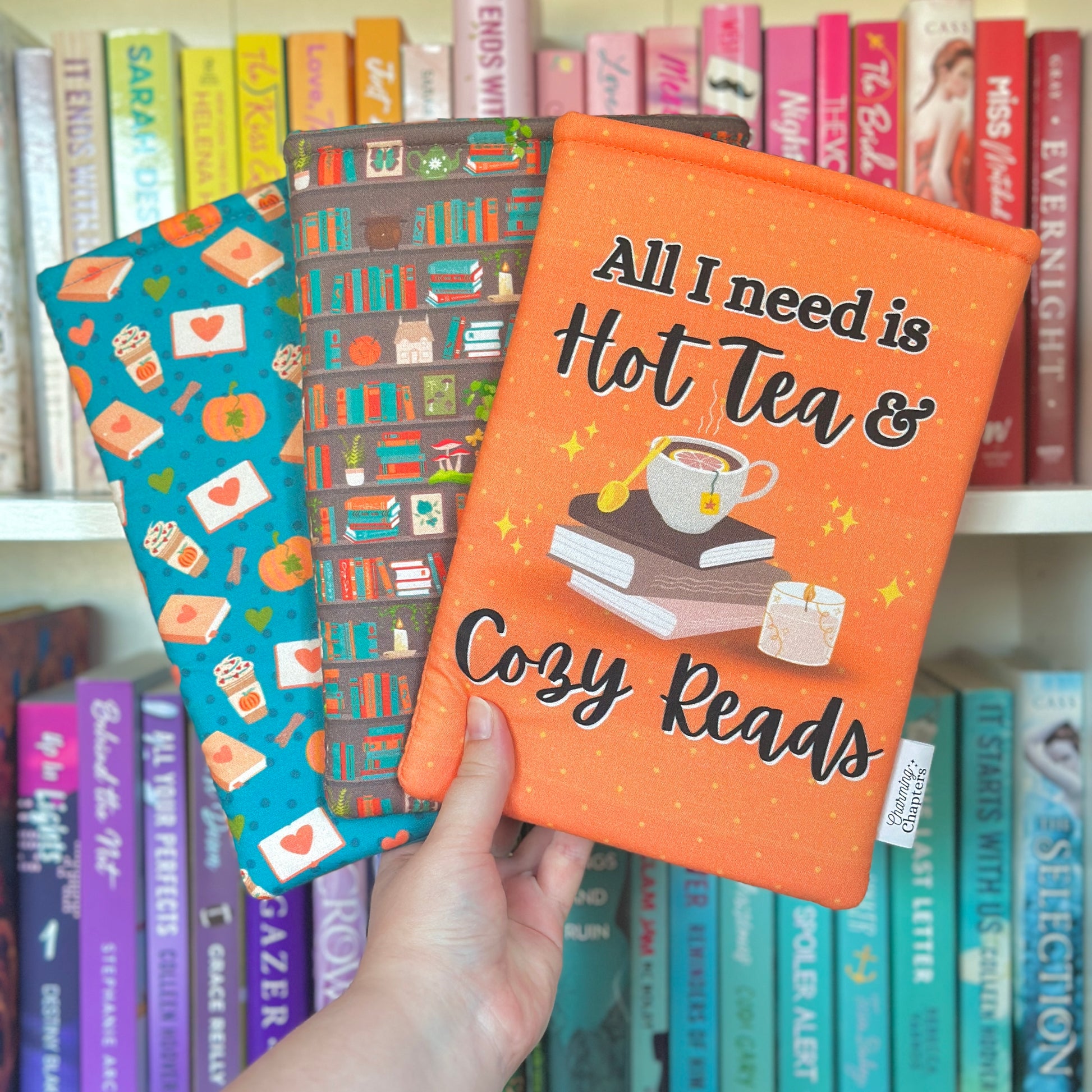 This book sleeve's pattern features a hot tea & cozy reads design on an orange polka dot background. This sleeve also has a matching solid black inside lining.