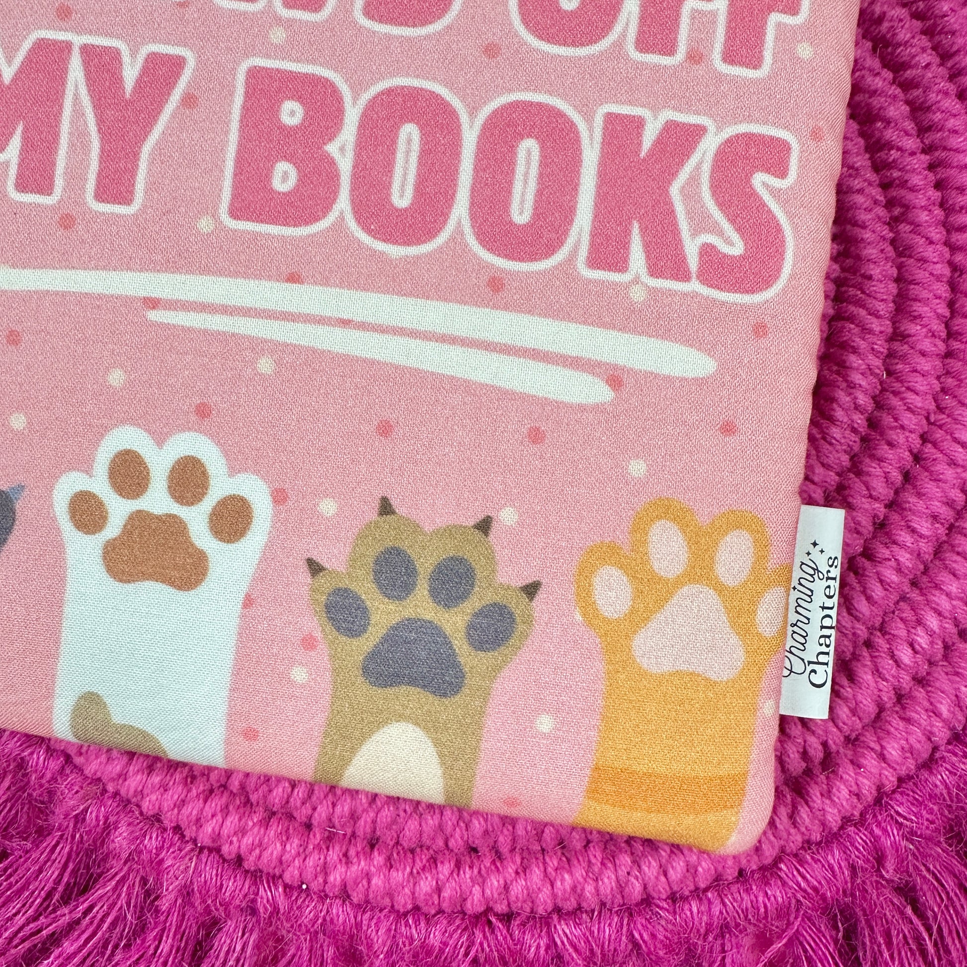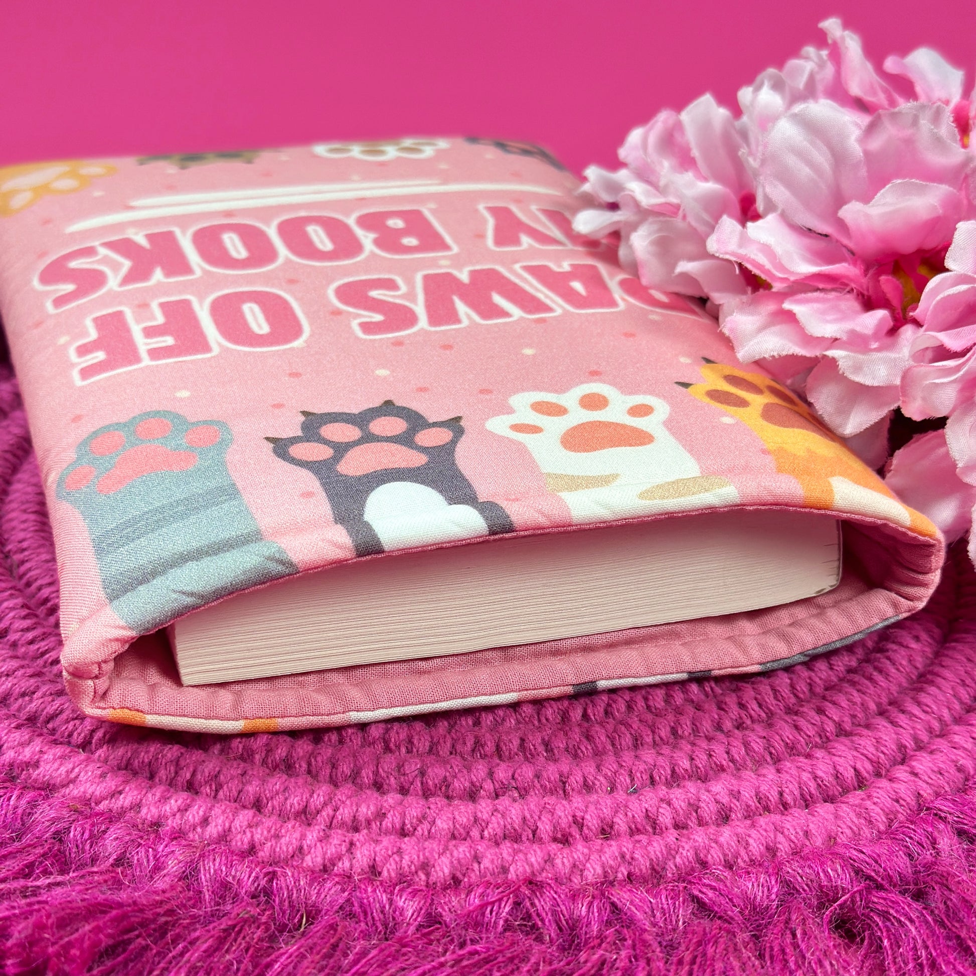 This book sleeve's pattern features a cat and dog paw design with the quote "Paws Off My Books" on a pink polka dot background. This sleeve also has a matching pink inside lining.