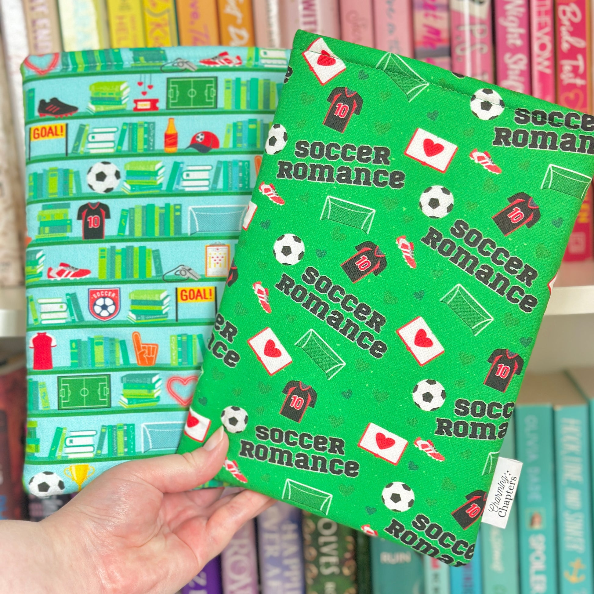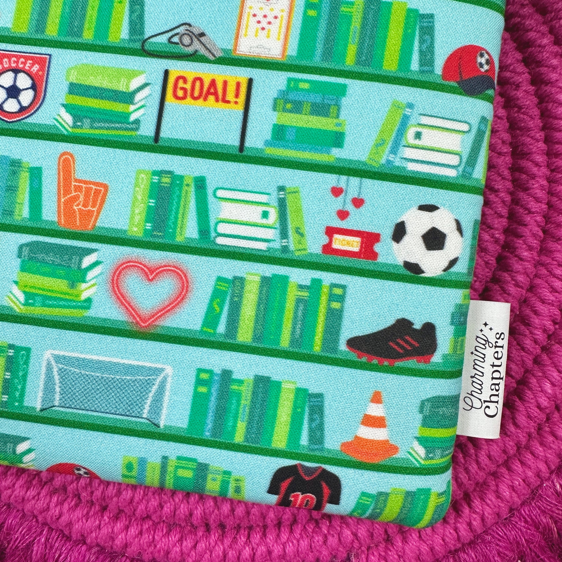 This book sleeve's pattern features a soccer romance book shelf design. This sleeve also has a matching solid green inside lining.