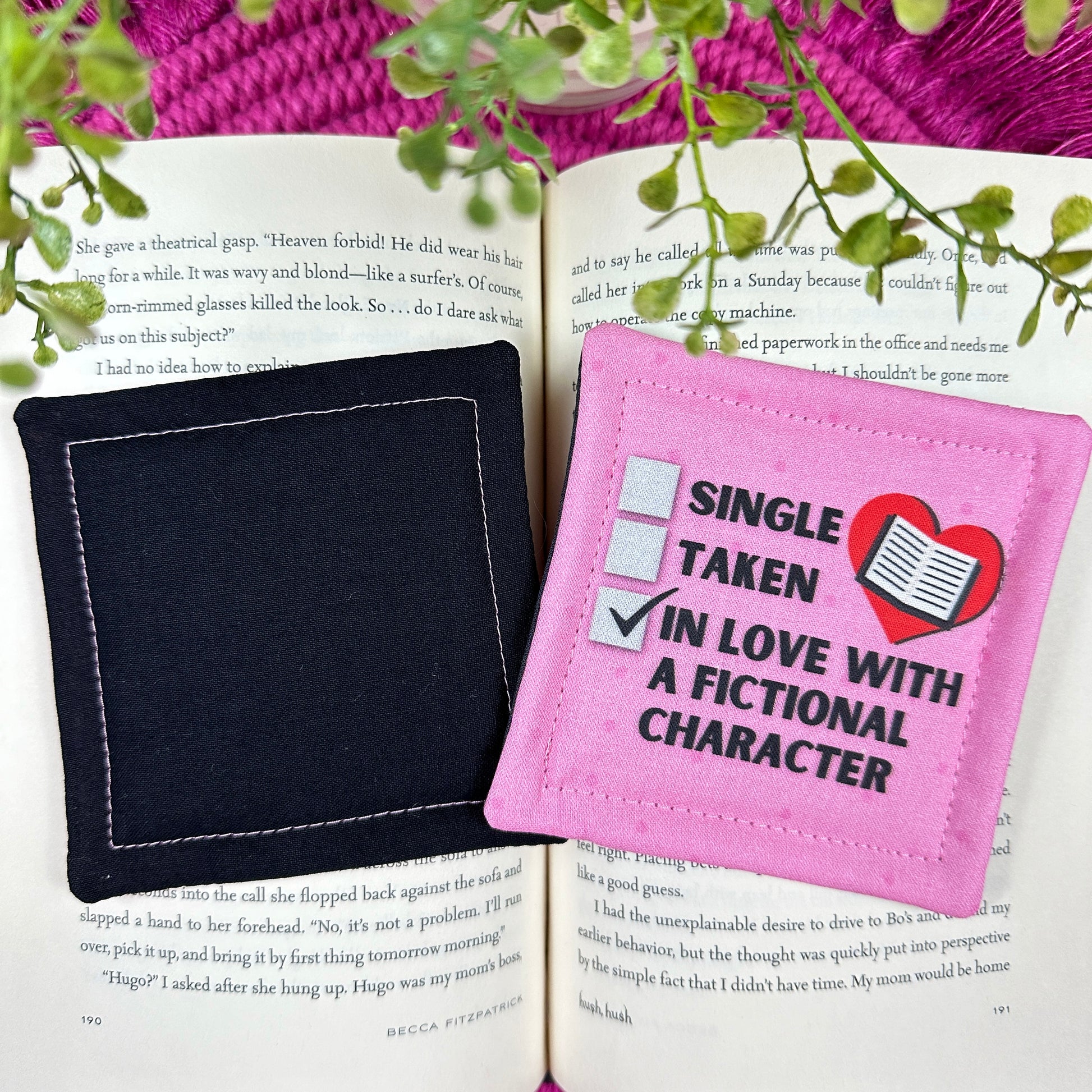 The pattern on this mug rug features a "Single, Taken, In Love with a Fictional Character" design on a pink background.  The mug rug also has a solid black backing.